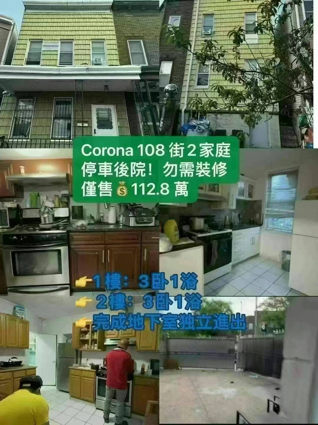 Corona纽约可乐娜房子出售Corona NY House For Sale新上市可乐娜房屋出售🔥可樂娜108 街2家庭+停車後院!地址:55-xx Van Cleef St, Corona, NY💰僅售:$112.8 萬🔥超級性價比!勿需裝修,即刻收租!可清空戶!目前收租8.6 萬!Corona中心幾年新装修两家庭,可清空过户!後院正街108街有停車位,後門Q58直接幾站到法拉盛!按时交租好租客,內部狀況良好:租客電費全部自理,👉1 樓:3卧1浴👉 2樓:3卧1浴👉完成地下室独立進出👉後院在108 街停車位917-364-9341 ping