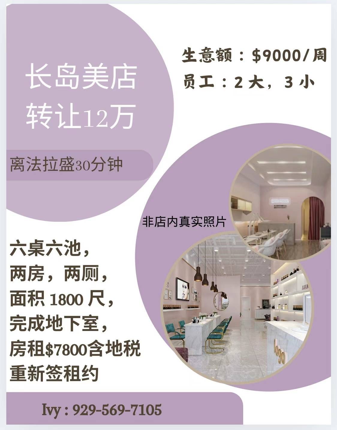 纽约长岛指甲店出售 新上市[烟花]独家代理,最新上市长岛离法拉盛30分钟纯白富人区美甲店转让12万欢迎合作转发Ivy: 929-569-7105