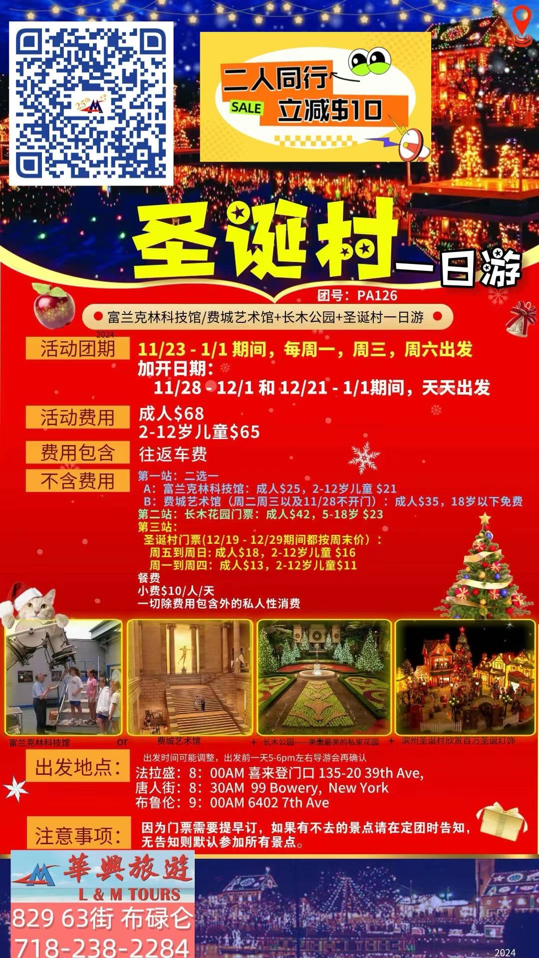 二人同行SALE 立减$10 圣诞村 团号:PA126 日游 富兰克林科技馆/费城艺术馆+长木公园+圣诞村一日游活动团期 11/23-1/1 期间,每周一,周三,周六出发