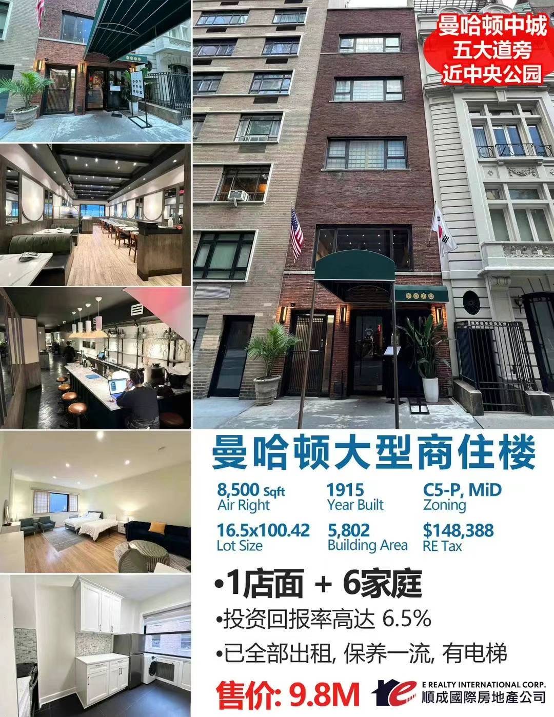 Manhattan纽约曼哈顿豪华康斗出售 Manhattan NY Condo For Sale新上市曼哈顿高级康斗出售順成 🎉独家新上市6家庭+1店面土地面积:1,657平方英尺房屋面积:5,802平方英尺建造年份:1915年Zoning: C5-P曼哈顿中城黄金商业地段,人流密集,商业繁华。临近标志性地标,如洛克菲勒中心、百老汇剧院区、第五大道奢侈品购物区、百万富翁街、中央公园等!这栋五层建筑配有电梯,地下室及一、二层楼目前由一家高档餐厅租用。楼内还有6个新装修的单间公寓,大楼维护良好。投资回报率高理想选择。Asking $9.8 M 欢迎咨询!🏢🌟顺成国际房地产E Realty Int'l Corp 646 239 1110
