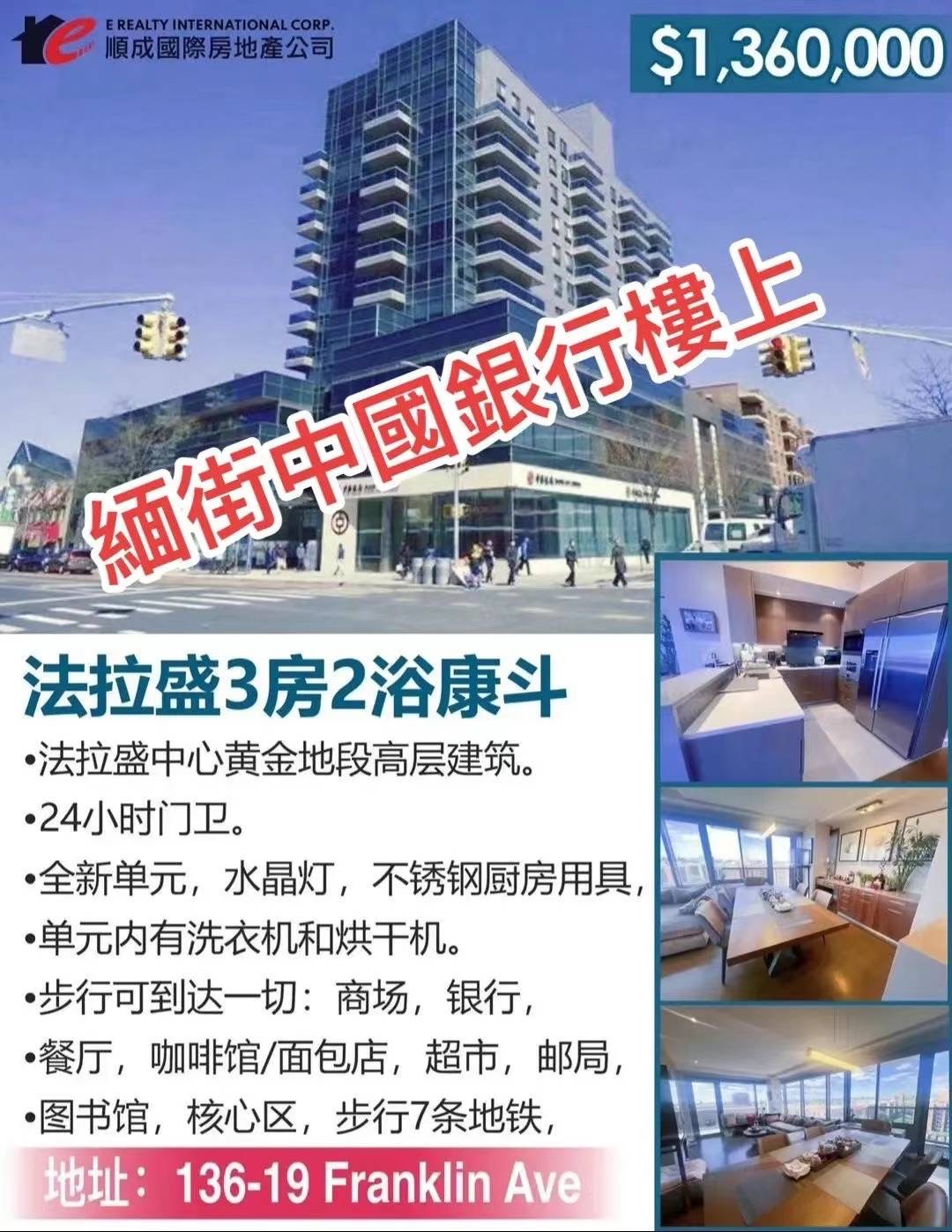 Flushing纽约法拉盛豪华康斗出售Flushing NY Luxury Condo For Sale新上市法拉盛高档康斗预售 出售 法拉盛中心缅街位置法拉盛心脏!缅街康斗三房一厅,两个卫生间,带双阳台,屋主自己买过来重金打造 !更新两个睡房打通一个大套房,所有的电器水晶灯都是高级配套!目前当两房二卫一厅使用,空间大面积是1200尺,楼下就是中国银行,24小时门卫、步行地铁超市,图书馆,餐馆,值得必看!管理费900 ,厨电全包 !地税一年3100 仅此一套 !机会难得!仅售价$136 万!欢迎转发合作!电:646-508-9880 Judy