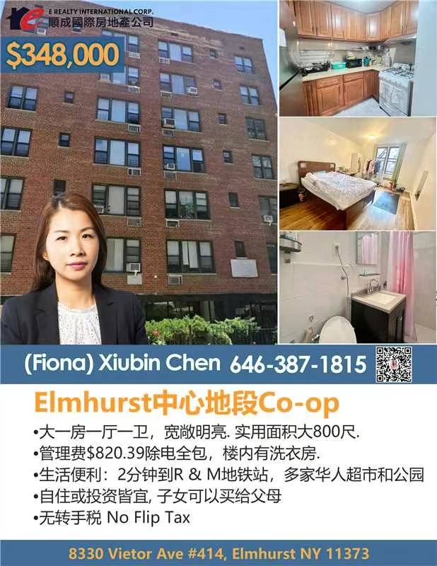 Elmhurst纽约艾姆赫斯特豪华公寓出售Elmhurst NY Coop For Sale新上市艾姆赫斯特高级合作公寓出售💎🔐Elmhurst中心地段Co-op 出售:大一房一厅一卫,宽敞明亮. 室内面积800尺. 管理费$820.39除电全包,楼内有洗衣房.🌟生活便利:2分钟到R & M地铁站,多家华人超市和公园🕊️自住或投资皆宜👍🌟子女可以买给父母🌟无转手税 No Flip Tax🥂售$34万8🔑地址:8330 Vietor Ave # 414,Elmhurst NY 11373欢迎合作☎️ Fiona Chen 646-387-1815