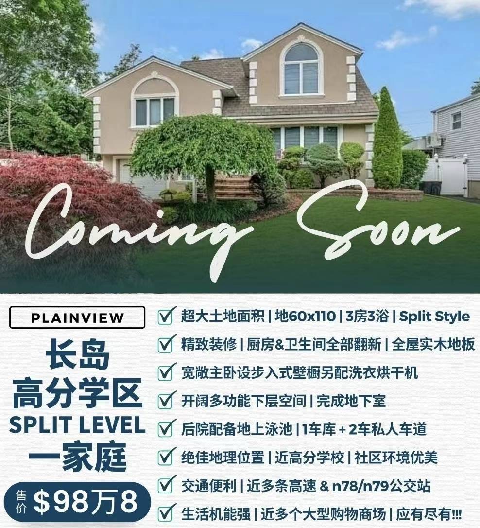 纽约长岛普莱恩维尤房子出售Plainview NY长岛普莱恩维尤房屋出售📢Coming Soon!!! 🤩长岛Plainview高分学区Split Level一家庭🏡💎拎包入住 | 超大土地面积 | 地60✖110 💎3房3浴 | Split Style | 开阔多功能下层空间✨精致装修 | 厨房、卫生间全部翻新✨全屋实木地板 | 主卧步入式壁橱另配洗衣烘干机✨后院配备地上泳池 | 1车库 + 2车私人车道✨绝佳位置 | 近高分学校 | 社区环境优美安静 ✨交通便利 | 近多条高速 & n78/n79公交站✨生活机能强 | 近多个大型购物商场 | 应有尽有!917 293 8698