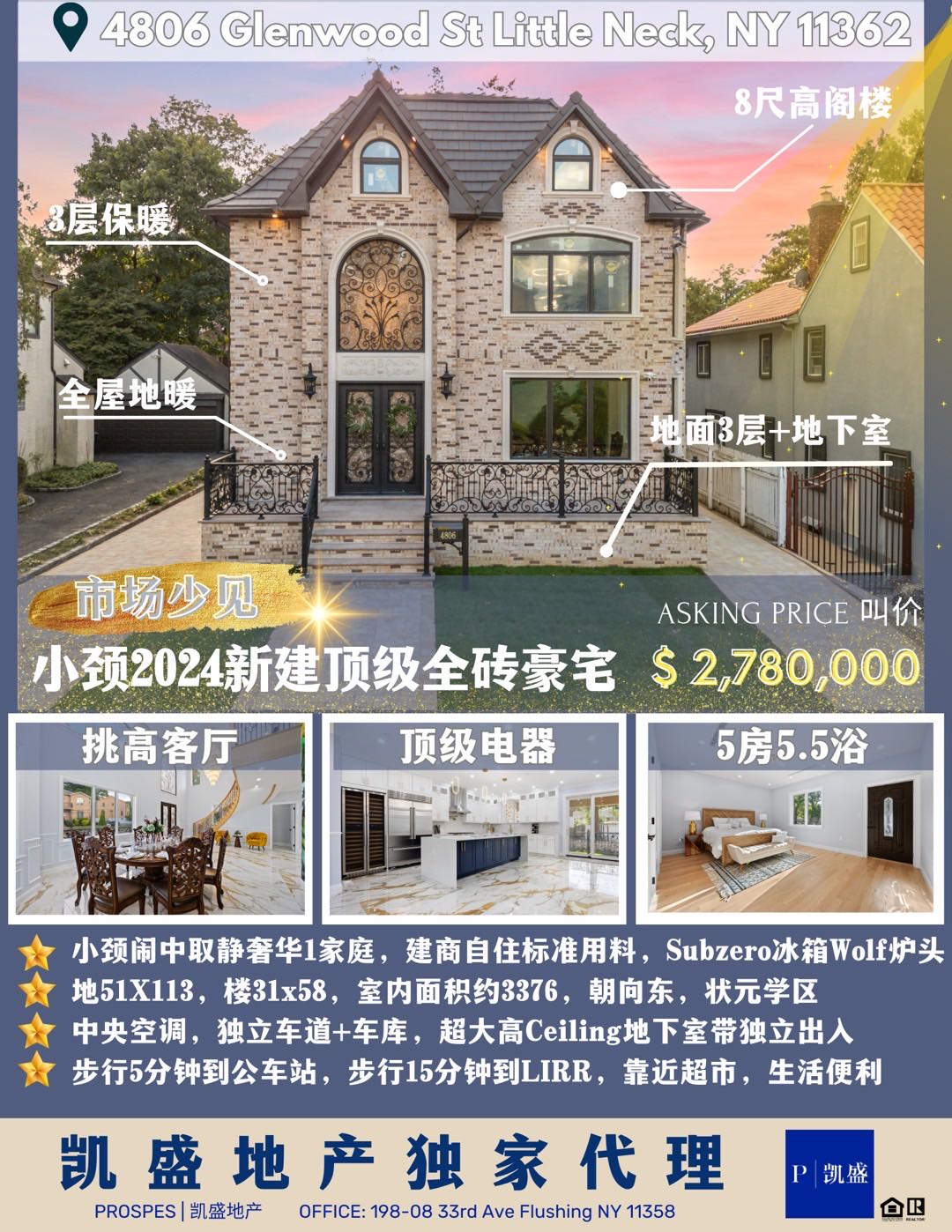 🌟【小颈2024新建顶级全砖1家庭豪宅】出售📍4806 Glenwood St Little Neck, NY 11362🌟Asking Price $$ 2,780,000🌟