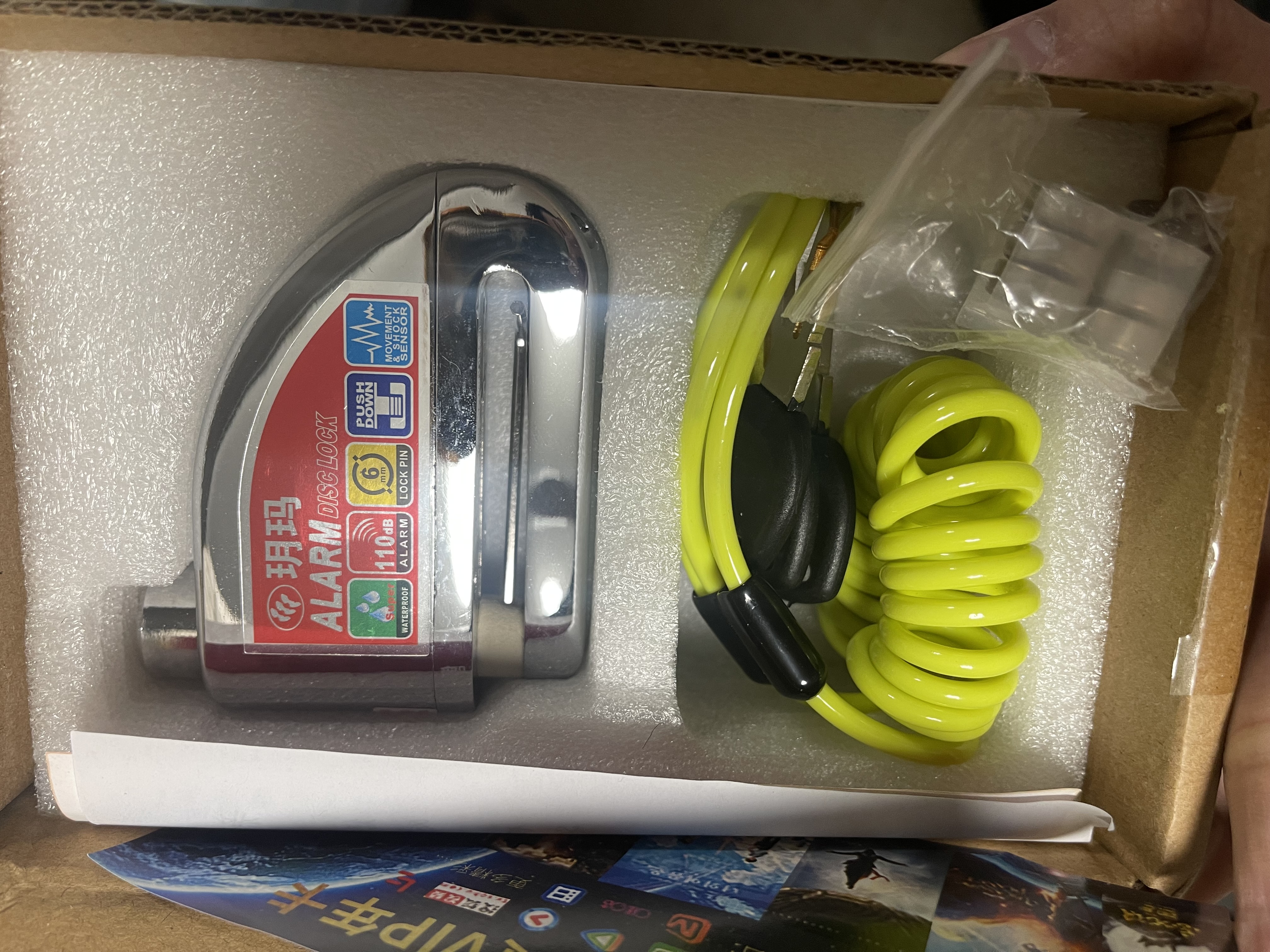 全新,没用过。国内名牌,玥玛锁,质量可靠。三把钥匙,含电池。带警报功能,防盗,锁车方便快速。碟刹锁。6315308482