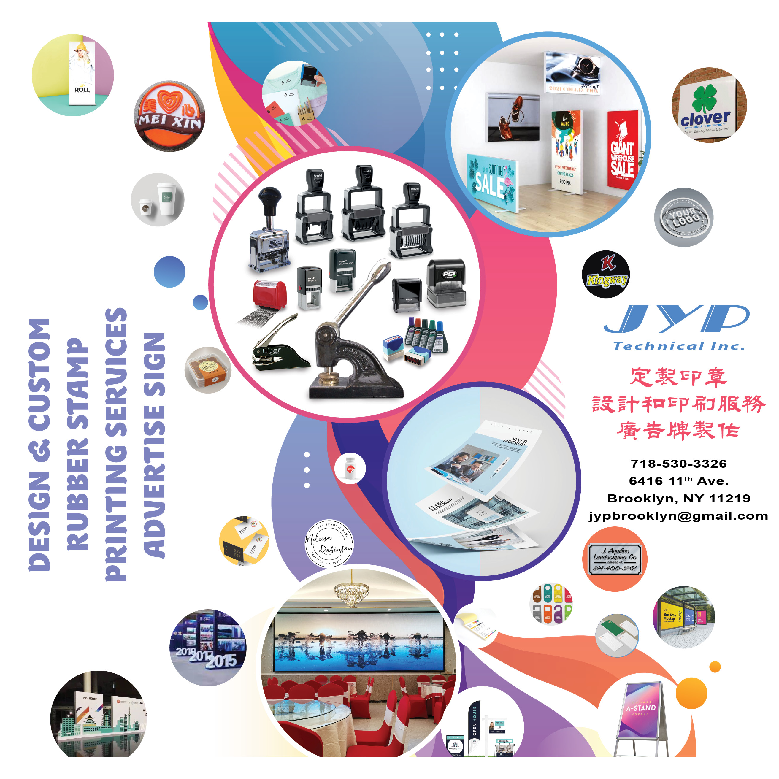 JYP Technical Inc. 公司主要负责设计和定制各种印章、签名印章、个人私章、书法或画家印章、公司印章、公证印章、LOGO 印章、银行印章、合约印章、学校印章、老师印章、图书馆印章、日期印章、数字印章、地址印章、服装印章、会员卡印章、食品印章、鸡蛋印章、高尔夫球印章、只要你需要的印章我们都能帮你定制.
