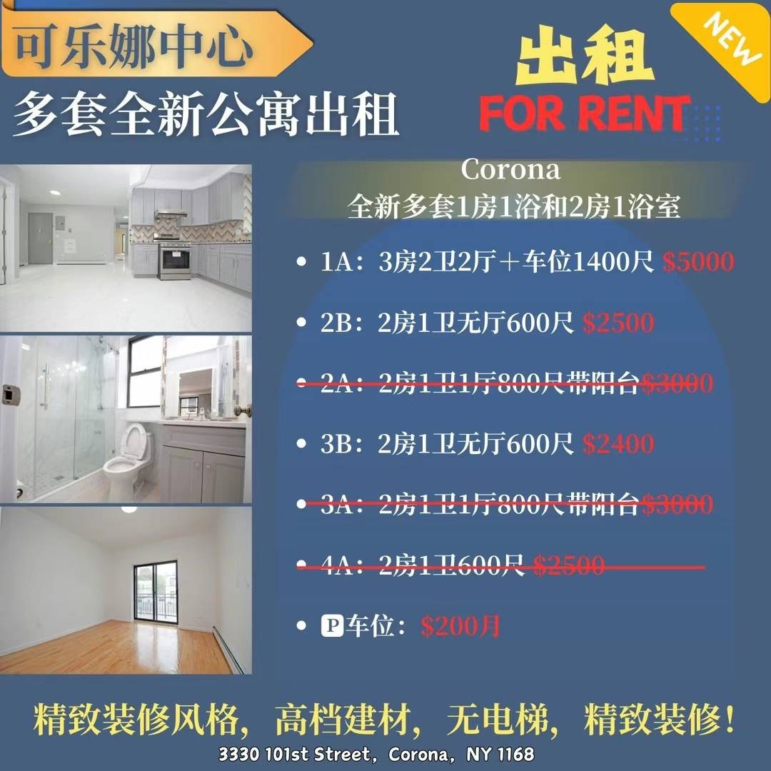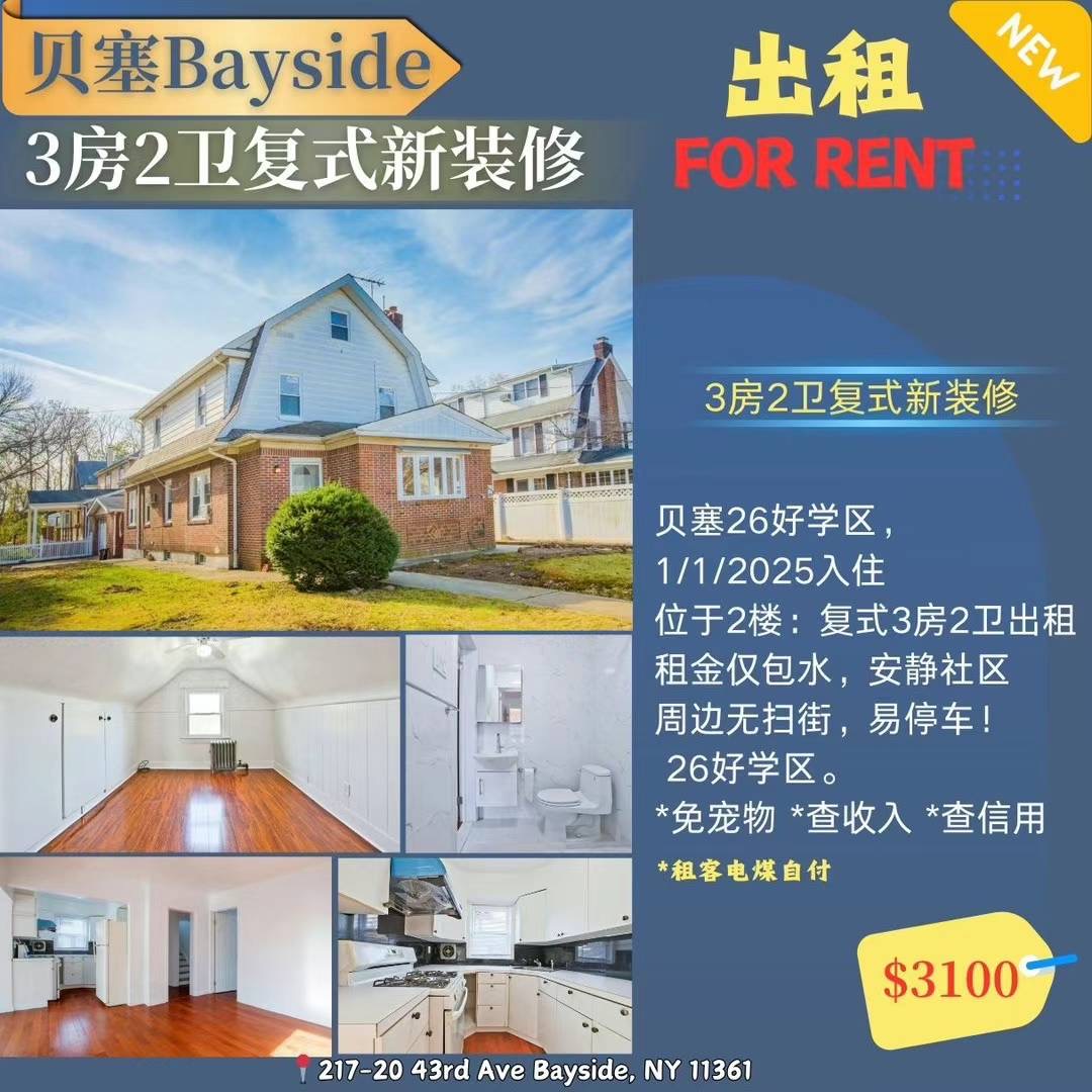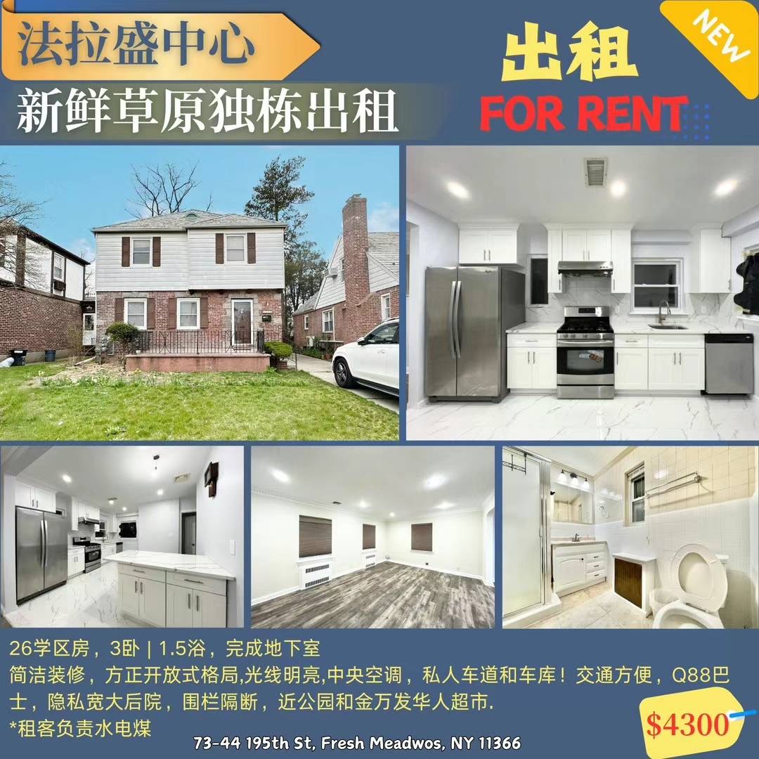 纽约法拉盛租房 Flushing NY 新上市法拉盛租赁纽约法拉盛豪华公寓出租Flushing Coop NY新上市法拉盛合作公寓大楼出租 纽约法拉盛租房Flushing NY 新上市法拉盛房子住宅出租纽约贝赛租房 Bayside NY新上市贝赛房子住宅出租纽约新鲜草原租房 Fresh meadows NY新上市新鲜草原房子住宅出租纽约小颈租房Little Neck NY House For Rent新上市小颈房屋住宅出租 纽约可乐娜租房Corona NY新上市可乐娜房屋住宅出租 🔹新鲜草原独栋一家庭出租 $4300🔹小颈单边豪华一家庭出租$5100🔹贝塞复式3房2卫新装修出租$3100🔹北法拉盛全新2房1卫公寓出租$2700🔹北法拉盛全包2房1卫出租$2200🔹科罗娜多套2小房1卫出租$2400起 917 293 8698
