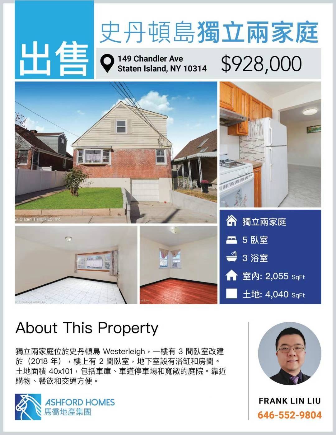 [庆祝]新上市 149 Chandler ave, SI, NY10314[庆祝]💰仅售 $92.8万⛳️5/6 格局 2⃣️家庭 , 18分钟车程到达8大道房:25x47, 地:40x101✅总面积2055尺1楼主家庭3房1卫+地下室2房1卫