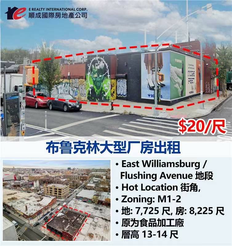 🎉順成最新代理廠房出租🌟East Williamsburg / Flushing Avenue 地段 🌟街角, 地:7,725尺, 房:8,225尺 Zoning M1-2 🌟原用食品加工廠 Hot Location 🌟層高 13-14 尺