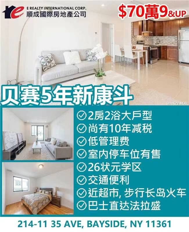 纽约贝赛康斗出售Oakland Gardens NY新上市贝赛康斗出售买卖 🔥最新降价$70萬9🎉貝賽新上市康斗,🌟5 年新 尚有10 年減稅🌟2套 2房2全浴, 帶陽台🌟車位可另購 [Party]顺成国际房地产 E Realty Int'l Corp3473318440