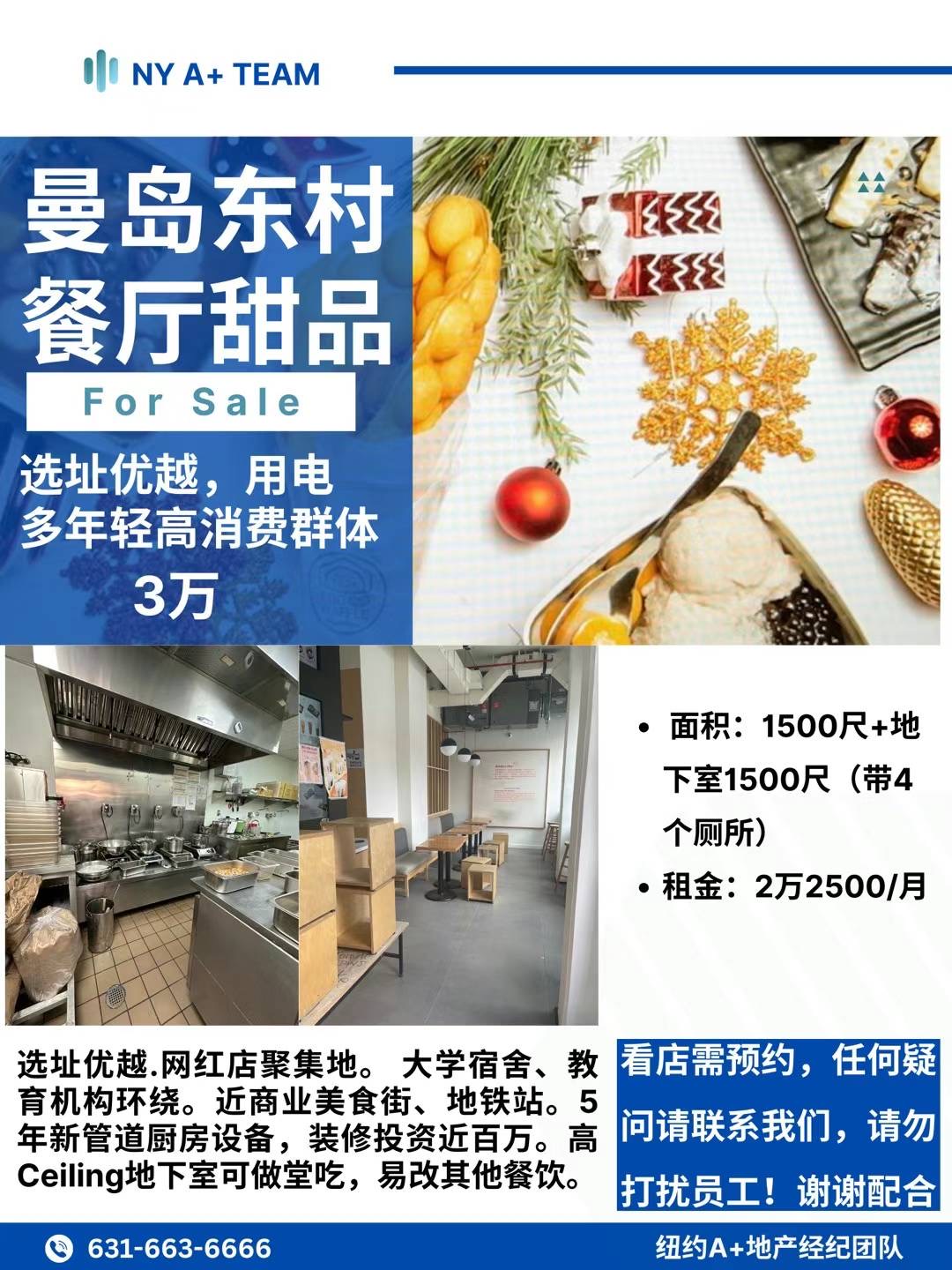 🤩捡漏价💥3万💥🍨曼哈顿东村餐厅饮品转让🍨🔹面积:1500尺+地下室1500尺(带4个厕所)🔹租约:4年🔹租金:$2万4/月🍵选址优越:大学宿舍、教育机构环绕。近商业美食街、地铁站。5年新管道厨房设备,装修投资近百万。高Ceiling地下室可做堂吃,易改其他餐饮。(用电)🌠看店需预约,任何疑问请联系我们,请勿打扰员工!谢谢配合🙏