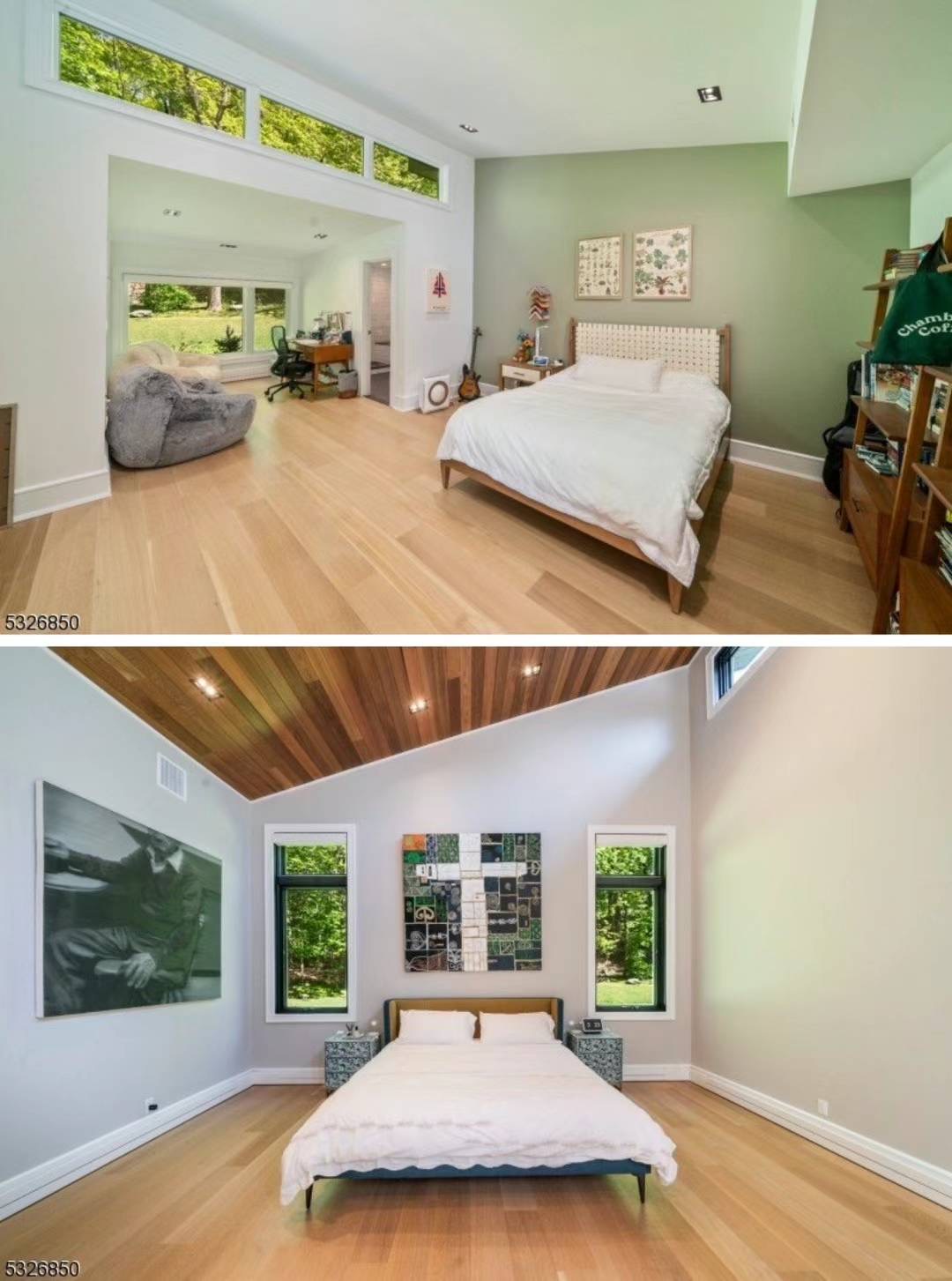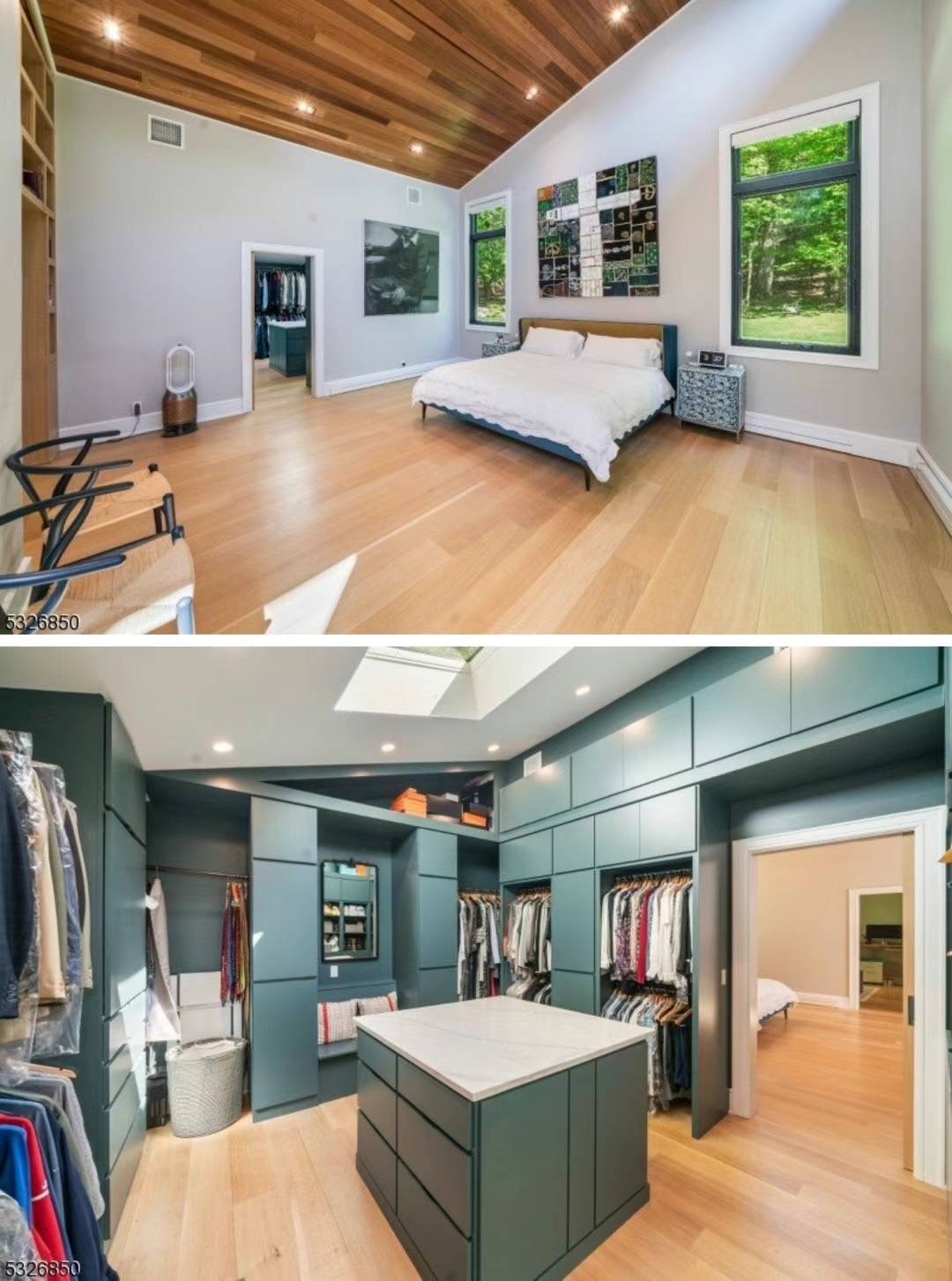✅主卧套房拥有高挑的雪松天花板和白橡木地板。