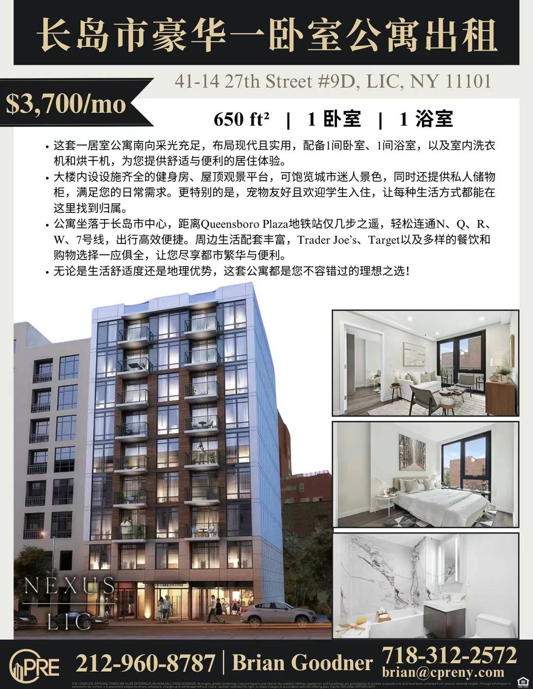 纽约长岛租房Long Island NY新上市长岛租赁✅ 长岛市 LIC 一房一卫出租41-14 27th street, Long Island City通勤便利,核心区,高层+阳台,洗烘机,健身房,露台租金3700。入住日期:1月25日2025年CPRE NY联系人:Brian Liu