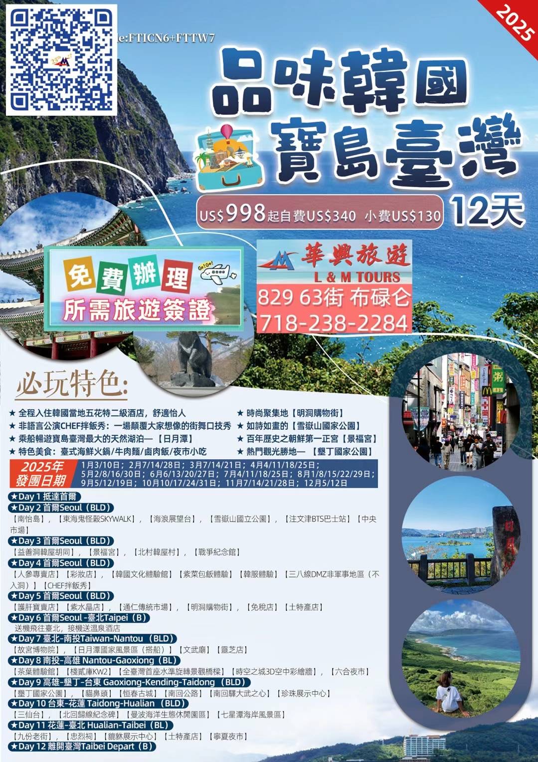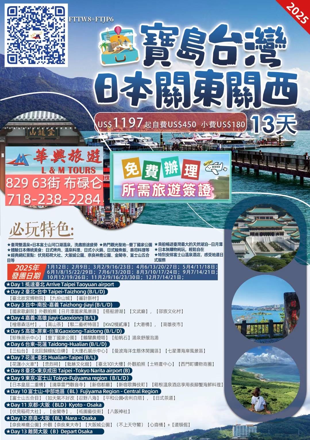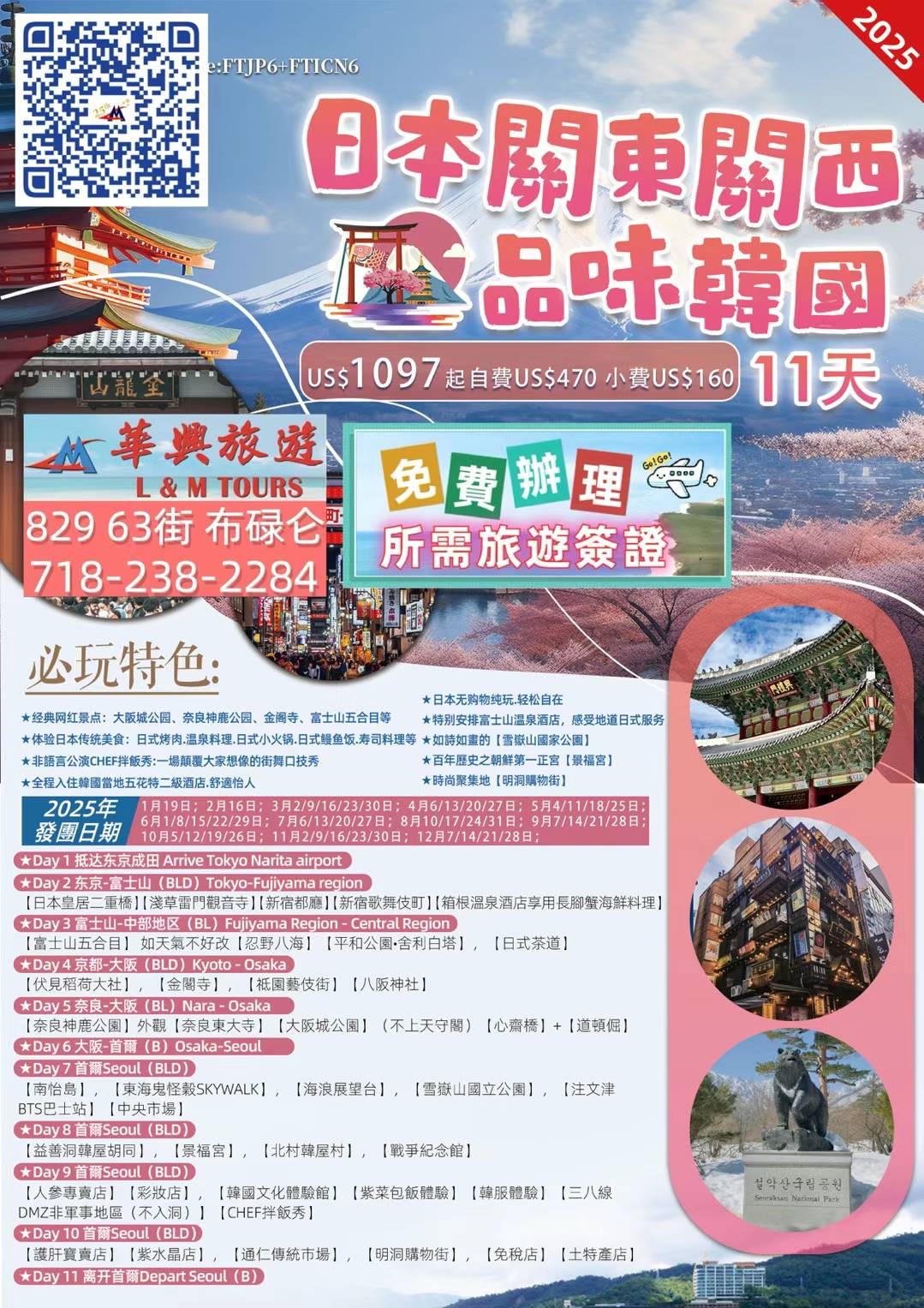 世界旅游❷⓿❷❺网红打卡日韓台連線系列1⃣寶島台灣日本關東關西13天 $11972⃣日本關東關西品味韓國11天 $10973⃣品味韓國寶島台灣12天 $998 👏每週發團,2人以上💯保證出發💪各地精選四至五華酒店👍優秀中文導遊服務🏞打卡最熱網紅景點