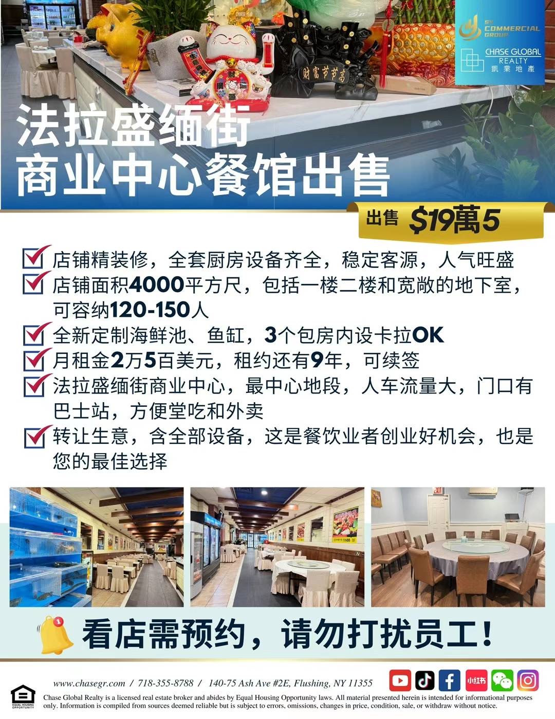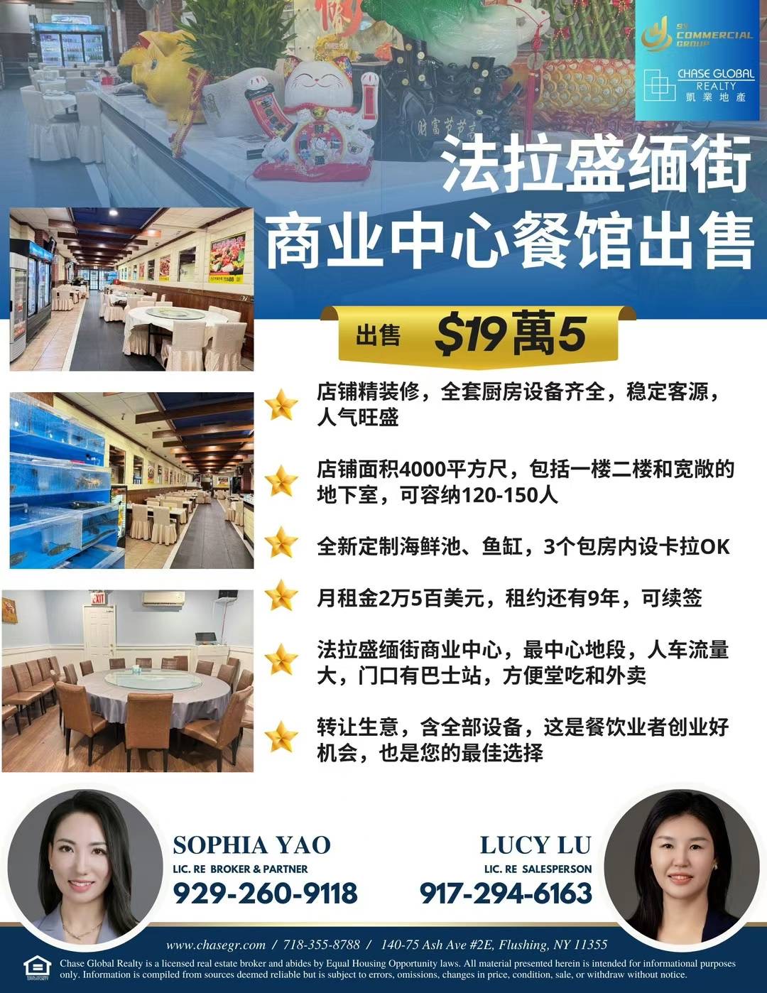 🎉 法拉盛缅街商业中心餐馆生意转让! 欢迎合作,详情如下: