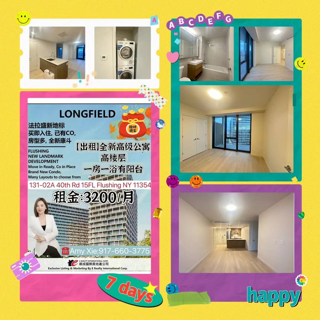 纽约法拉盛租房Flushing NY 新上市法拉盛房子住宅出租🎉【出租】Longfield 全新高级公寓高楼层出租 🎉1 房1浴有陽台💰租金$3200/月 (查收入信用)🎉大楼免费设施齐全,有门卫,健身房,小型電影院,瑜伽房,桑拿室,宠物洗浴区!露天公園,BBQ 烤肉區等等!🎉地理位置优越,近地铁站,各大超市,购物广场!车位可以另租!随时看房,有钥匙🔑欢迎合作☎️Amy Xie:917-660-3775