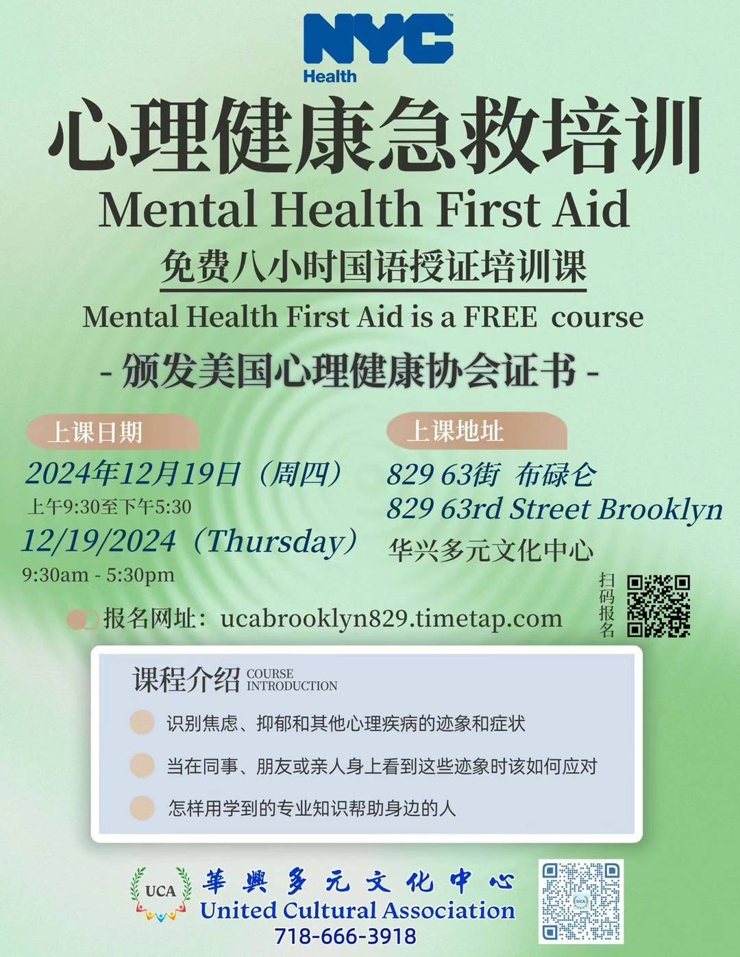 免费心理健康急救培训八小时国语授证培训课颁发美国心理健康协会证书-12月19日(周四)上午9:30至下午5:30上课地址 829 63街 布碌仑 华兴多元文化中心