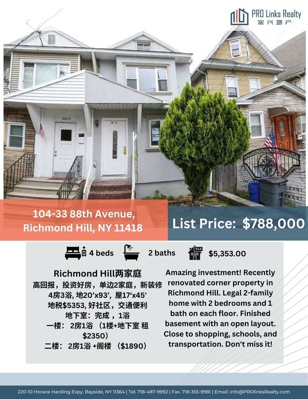 纽约皇后区列治文山房子出售Richmond Hill Queens NY新上市列治文山房屋出售买卖🎉Richmond Hill两家庭🎉高回报,投资好房,单边2家庭,新装修🧧售$78万84房3浴, 地20’x93’, 屋17‘x45'地税$5353, 好社区,交通便利不清空,好租客,租客正常交租 有交租证明🏠地下室:完成 ,1浴🏠一楼: 2房2浴 (1楼+地下室 租$2350)🏠二楼: 2房1浴 +阁楼 ($1890)🧧售$78万8 🏠地址:104-33 88th Ave.,Richmond Hill, NY 11418👏欢迎合作转发 ☎️Lillian 刘917-418-8233 ☎️Benson 潘 646-301-8280