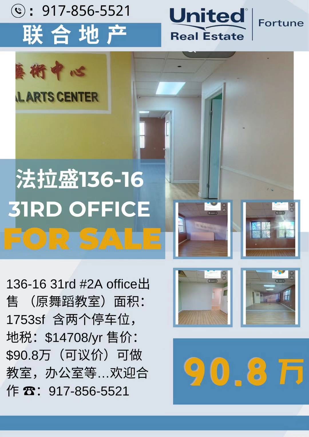 136-16 31rd #2A office出售 (原舞蹈教室)面积:1753sf 含两个停车位,地税:$14708/yr 售价:$90.8万(可议价)可做教室,办公室等…欢迎合作 ☎️:917-856-5521
