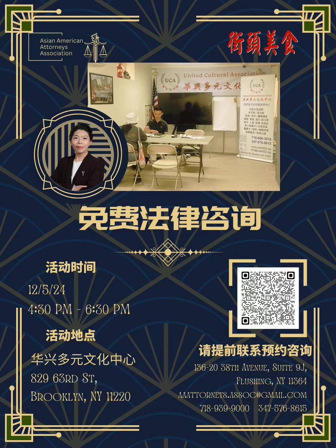 免费法律咨询4:30 - 6:30pm华兴多元文化中心 829 63rd St, Brooklyn,NY