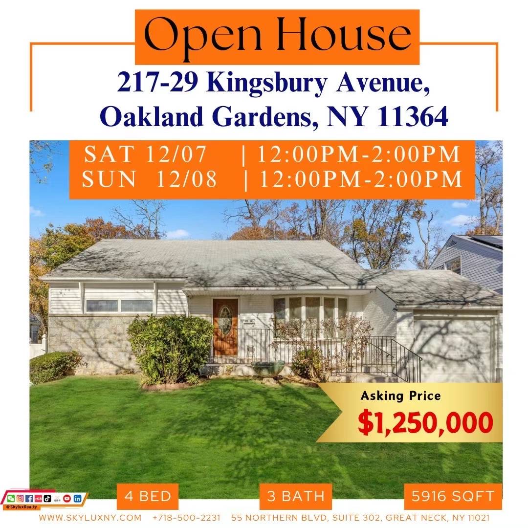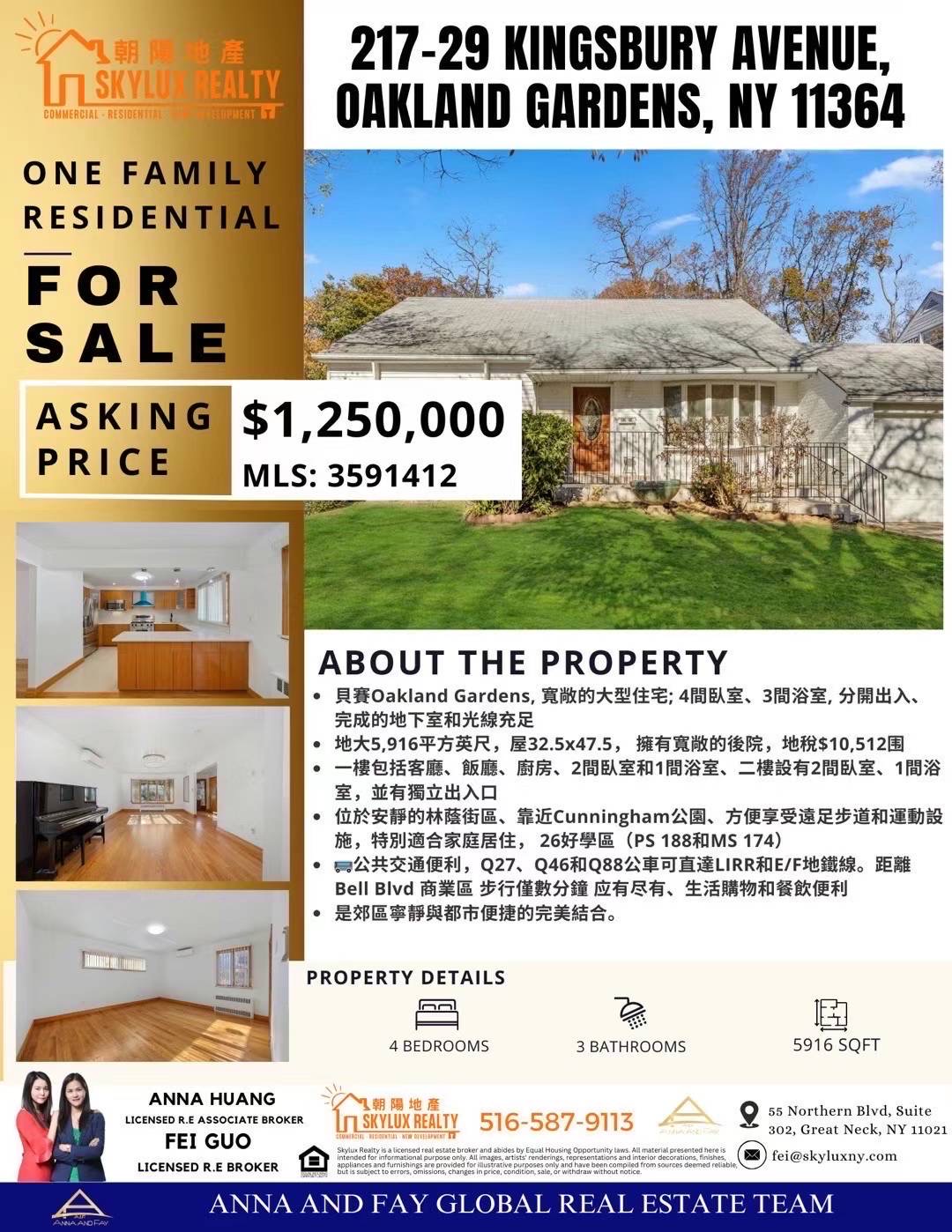 Open House NY周末纽约房地产公展Top New York Agent纽约资深千万经纪独家代理好房源Weekend Openhouse 周六 12:00pm-2:00pm周日12:00pm-2:00pm🆕✨新上市✨🔥貝賽Oakland Gardens寬敞的大型住宅4間臥室、3間浴室分開出入、完成的地下室 $125万 朝南 光線充足地大5,916平方英尺屋32.5x47.5擁有寬敞的後院地稅$10,512一樓包括客廳、飯廳、廚房、2間臥室和1間浴室、二樓設有2間臥室、1間浴室,並有獨立出入口位於安靜的林蔭街區、靠近Cunningham公園、方便享受遠足步道和運動設施 特別適合家庭居住26好學區(PS 188和MS 174)公共交通便利,Q27、Q46和Q88公車可直達LIRR和E/F地鐵線。距離Bell Blvd 商業區 步行僅數分鐘 应有尽有、生活購物和餐飲便利是郊區寧靜與都市便捷的完美結合