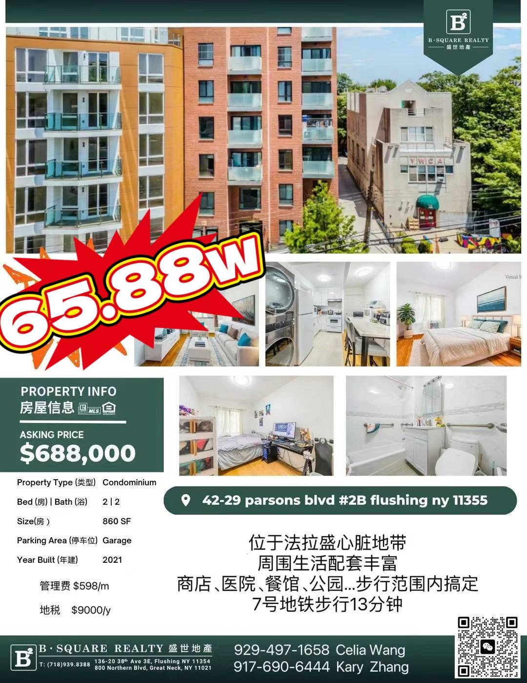 纽约法拉盛豪华康斗出售Flushing Luxury Condo NY 新上市法拉盛高档康斗出售法拉盛豪华康斗独家预售买卖 👍直降3w🔥法拉盛中心2021年新2房2浴电梯condo屋况佳,格局好,拎包入住。860尺/管理费590/m除电全包;地税9000/y🌟卖家付BA🌟 9294971658 Celia