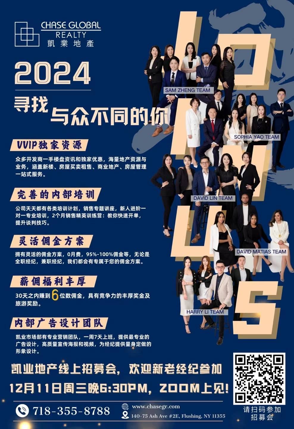 华人168 纽约华人168大房地产公司360 纽约高端经验房地产经纪 The Best Real Estate Agent in New York 纽约地产经纪最佳地产经纪人🏡 2024,寻找与众不同的你!🌟你还在找一个能让你爆单、月入百万的机会吗?凯业地产在等你!无论你是房地产老炮儿,还是职场小白,我们都有你想要的!👇⏰ 线上招募会 | 12月11日(周三)晚上6:30,Zoom见! ⏰https://us06web.zoom.us/j/89793619359