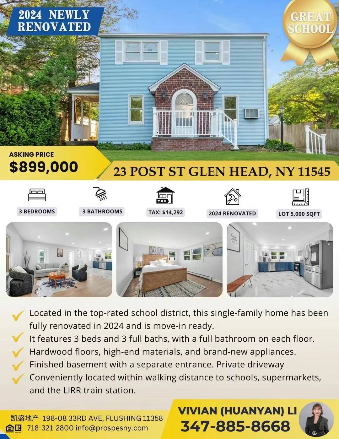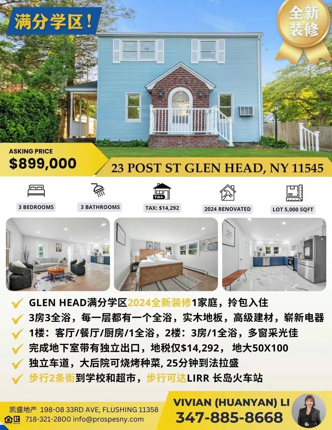 纽约长岛格伦黑德房子出售Glen Head NY新上市长岛格伦黑德学区房屋独家出售买卖💥精选好房新上市💥凯盛地产独家代理❗️【满分学区Glen Head全新装修1家庭】出售📍23 Post St Glen Head, NY 11545💰Asking Price $899,000💎全新装修;💎地税: $14,292; 💎地大50x100; 💎3房3全浴🔵Glen head满分学区2024全新装修1家庭,拎包入住🟠共3房3全浴,每一层都有一个全浴,实木地板,高级建材,崭新电器🔴1楼:客厅/餐厅/厨房/1全浴,2楼:3房/1全浴,多窗采光佳🟢完成地下室带有独立出口,地税仅$14,292, 地大50x100🟡独立车道,大后院可烧烤种菜,🔵满分学校就在家门口,步行2条街到学校和超市,步行可达LIRR长岛火车站,开车25分钟到法拉盛,绝佳地理位置,不要错过!Contact Agent:🌟Vivian Li ☎️347-885-8668