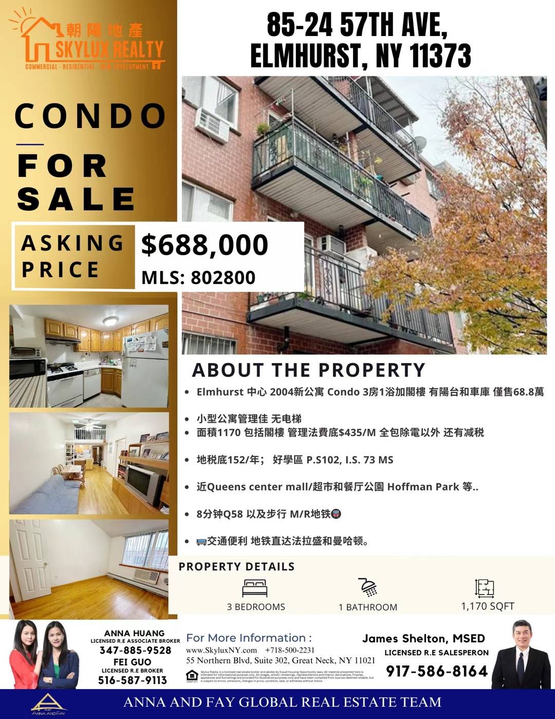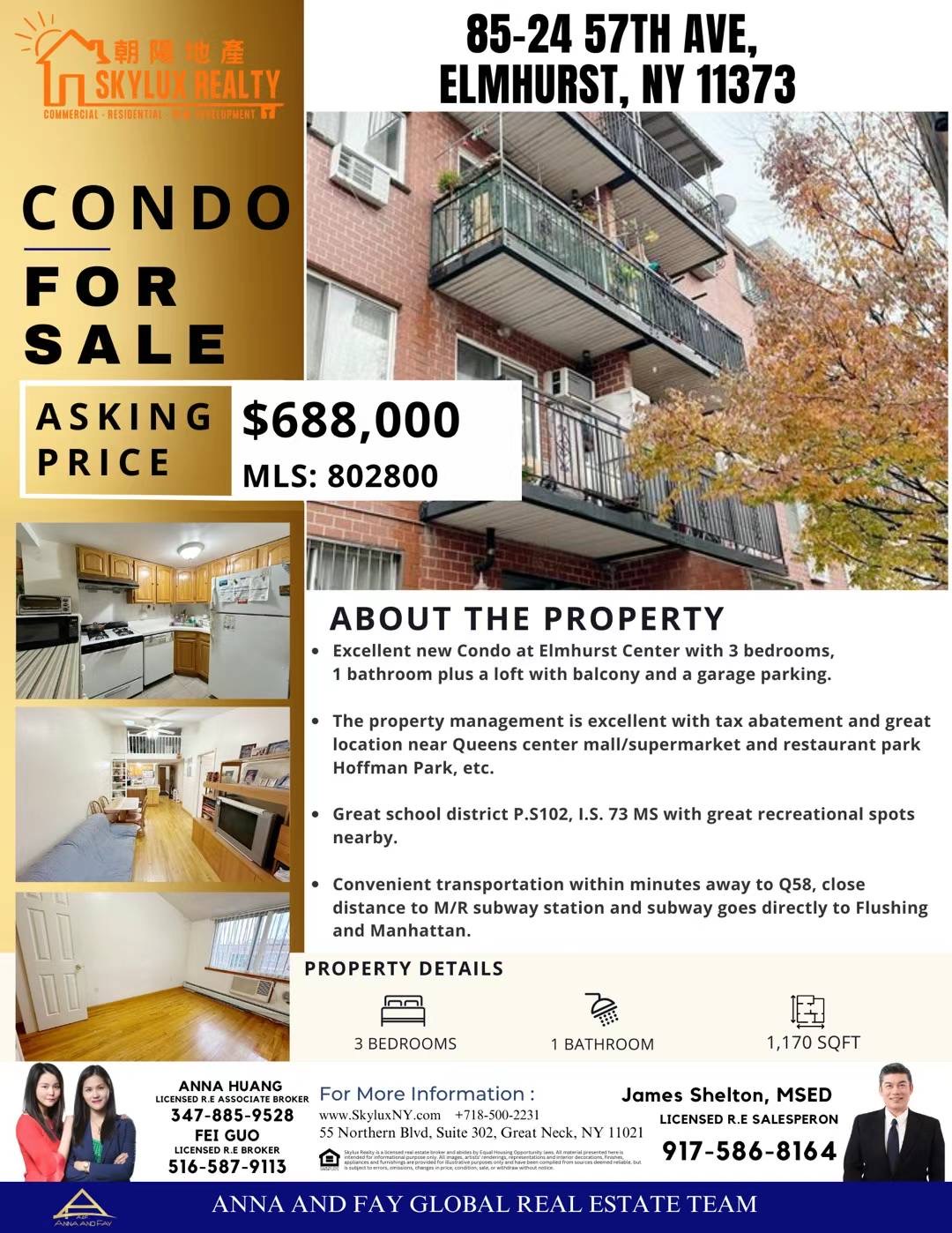 纽约艾姆赫斯特房子出售Elmhurst NY 新上市艾姆赫斯特房屋住宅出售艾姆赫斯特豪宅独家出售买卖🔥✨新上市✨🔥🏡Elmhurst 中心 2004新公寓 Condo 3房1浴加閣樓 有陽台和車庫 僅售68.8萬 👍小型公寓管理佳 无电梯面積1170 包括閣樓 管理法費底$435/M 全包除電以外 还有减税 🔥地税底152/年好學區 P.S102, I.S. 73 MS ✨近Queens center mall/超市和餐厅公園 🌳Hoffman Park 等..8分钟Q58 以及步行 M/R地铁🚇🚌交通便利 地铁直达法拉盛和曼哈顿可以清空 方便约看🤝欢迎合作☕️ANNA&FAY TEAM 朝阳地产 Skylux Realty☎Text Fay: 516-587-9113