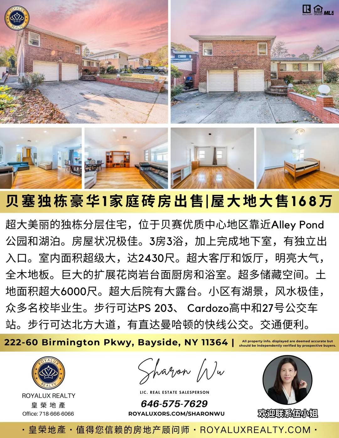 360屋大地大售168万 华人168 纽约贝赛房子出售Bayside NY新上市 贝赛房屋出售贝赛豪华住宅出售独家代理买卖🔥周末公展,欢迎大家🔥👑皇荣地产新上市独家代理好房源👑贝塞独栋豪华1家庭砖房出售| 屋大地大售168万👑房子介绍:超大美丽的独栋分层住宅,位于贝赛优质中心地区靠近Alley Pond公园和湖泊。房屋状况极佳。3房3.5浴,加上完成地下室,有独立出入口。室内面积超级大高达2430尺。超大客厅和饭厅,明亮大气,全木地板。巨大的扩展厨房和浴室。超多储藏空间。土地面积6000尺。超大后院有大露台。小区有湖景,风水极佳,众多名校毕业生。步行可达PS 203、 Cardozo高中和27号公交车站。步行可达北方大道,有直达曼哈顿的快线公交。交通便利。欢迎同行转发合作及约看!☎️646-575-7629