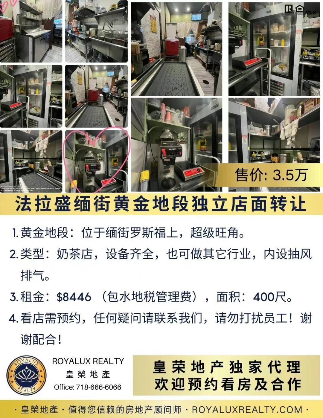 👑皇荣地产独家代理商业生意买卖👑法拉盛缅街黄金地段独立店面转让 | 售价3.5万1.黄金地段:位于缅街罗斯福上,超级旺角。2.类型:奶茶店,设备齐全,也可做其它行业,内设抽风排气。 3.租金:$租金 8446 (包水地税管理费),面积:400尺。4.看店需预约,任何疑问请联系我们,请勿打扰员工!谢谢配合!