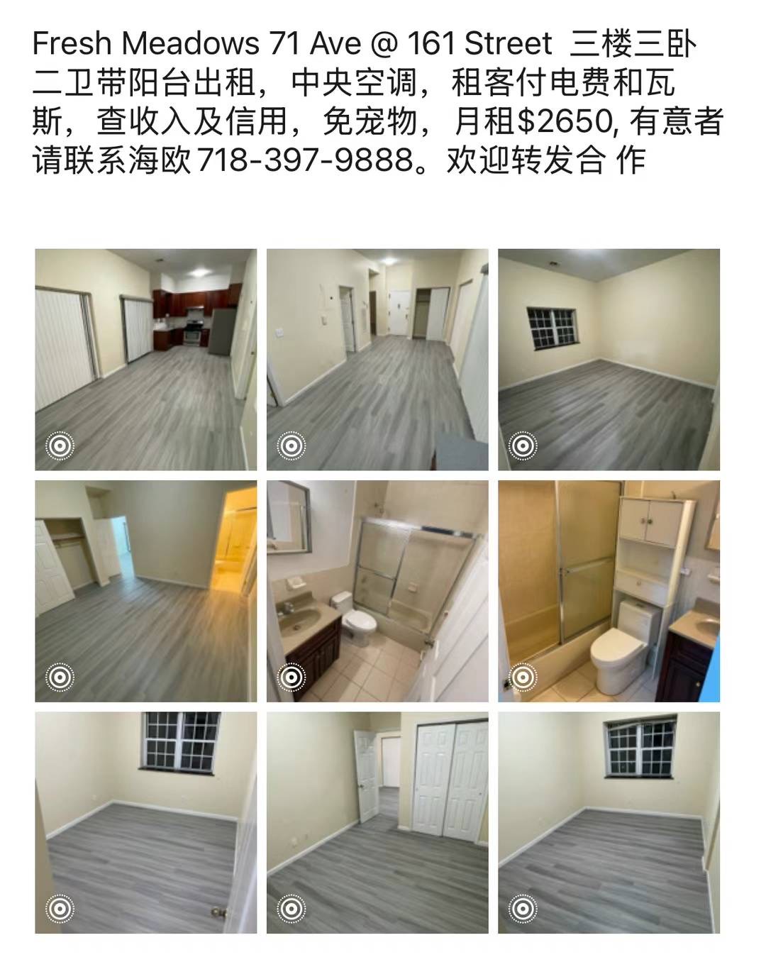 纽约新鲜草原房子出售 Fresh meadows NY 新上市新鲜草原房屋出售新鲜草原豪宅独家出售买卖 Fresh Meadows 71 Ave @ 161 Street 三楼三卧二卫带阳台出租,中央空调,租客付电费和瓦斯,查收入及信用,免宠物,月租$2650, 有意者请联系海欧718-397-9888。欢迎转发合作