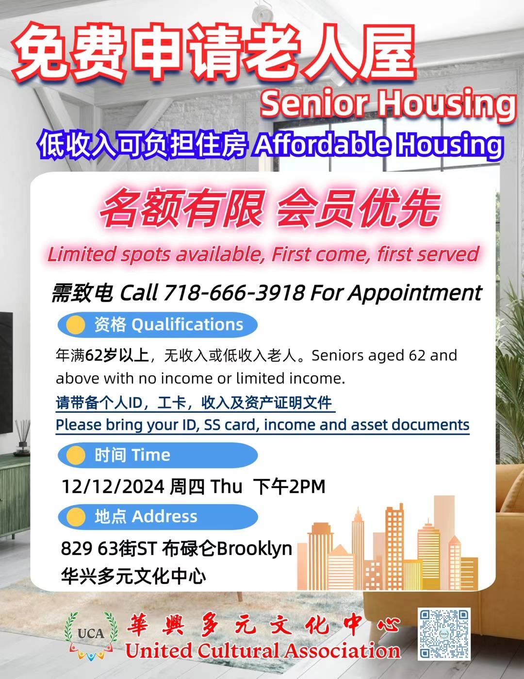 免费申请老人屋星期四12月12日下午二点829 63 St Brooklyn 华兴多元文化中心名额有限,会员优先