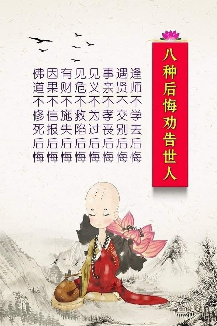 第七,我们应该相信“如是因,如是果”(因为你种什么因就会得什么果)的业报真理,所以要时时刻刻警惕自己,不要种下恶因,否则感受恶果时后悔莫及。这就是第七“因果不信报后悔”。