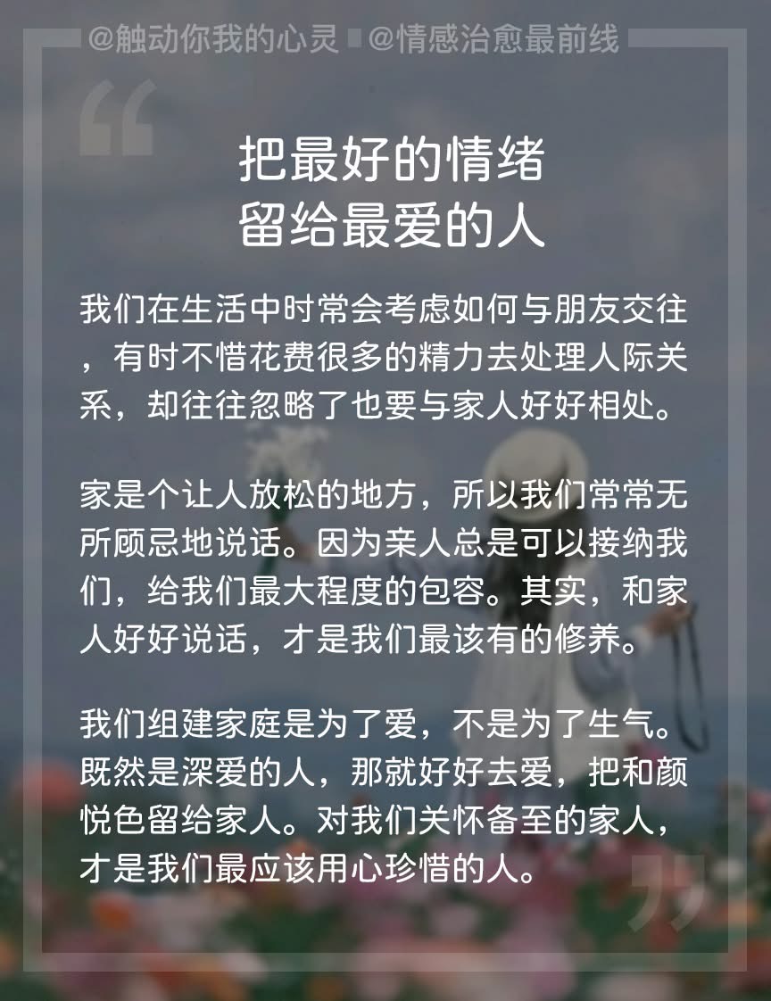 既然是深爱的人,那就好好去爱,把和颜悦色留给家人。对我们关怀备至的家人,才是我们最应该用心珍惜的人。
