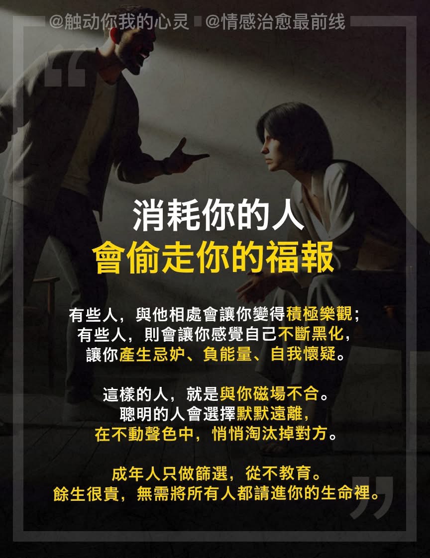 因为你的福报,正在被消耗。有些人,带来的是积极乐观的能量;有些人,却让你陷入忌妒、负能量、自我怀疑;他们的存在,是在偷走你的时间和福报。