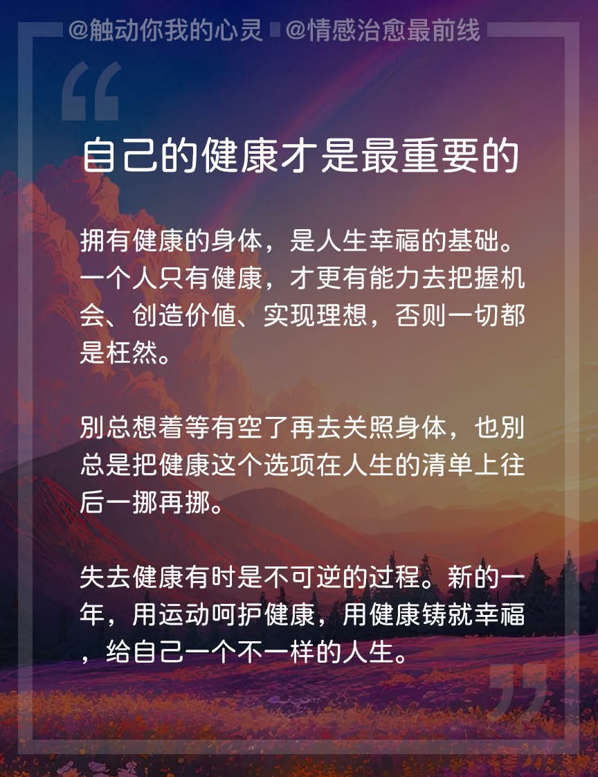 拥有健康的身体,是人生幸福的基础。一个人只有健康,才更有能力去把握机会、创造价值、实现理想,否则一切都是枉然。
