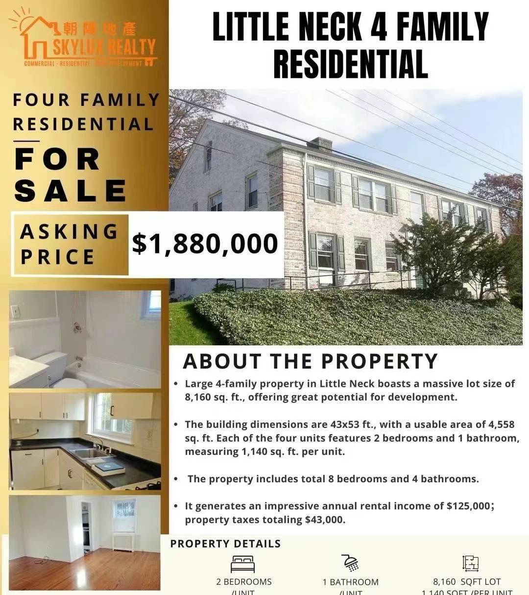 纽约小颈房子出售Little Neck NY 新上市小颈房屋出售小颈豪宅独家出售买卖[太阳][太阳]🥇🥇🆕🔥小徑大型4家庭 地大8160 可以建2棟豪宅 屋43x53 使用面積4558、每個單位2房1浴 1140平方英尺 總共4個單位 租金125,000/年、地稅4.3萬8個臥室4浴 188万。👏歡迎約看ANNA &FAY TEAM朝阳地产🔥🔥Skylux Realty ☎️(917)833-8136ℹ️More Info:www.skyluxny.com🏣Office: 55 Northern Blvd, Great Neck, NY 11021