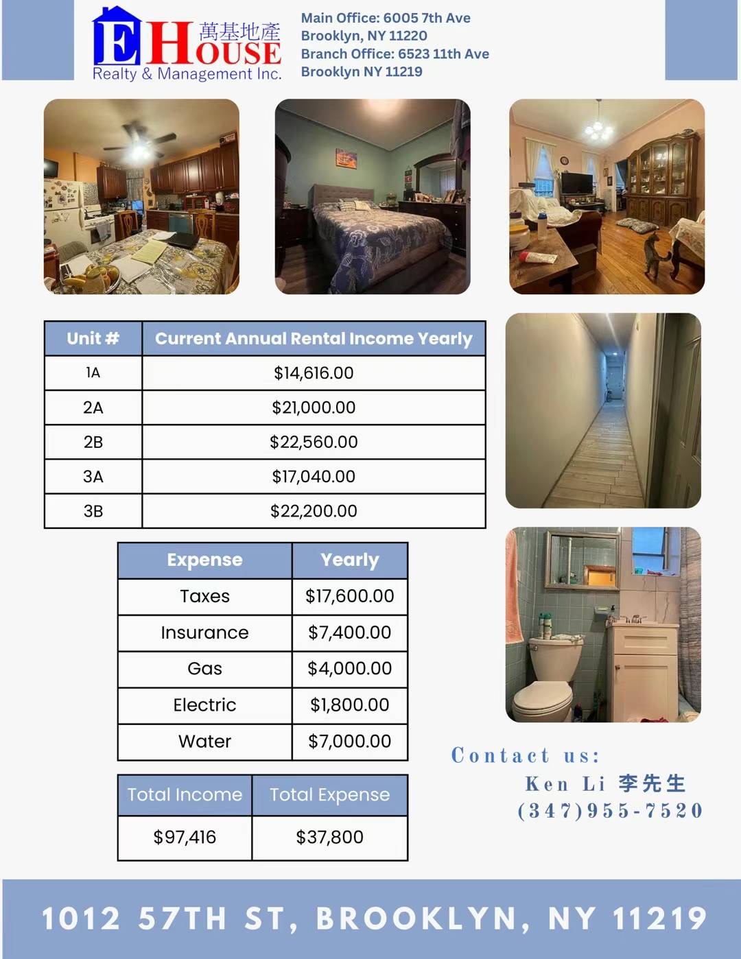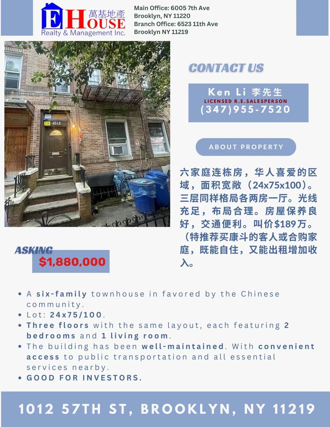 纽约布鲁克林房子出售 Brooklyn NY新上市布碌仑房屋住宅出售布鲁克林豪宅独家出售买卖10大道57街六家庭出售189万. 随时约看:3479557520 Ken Li