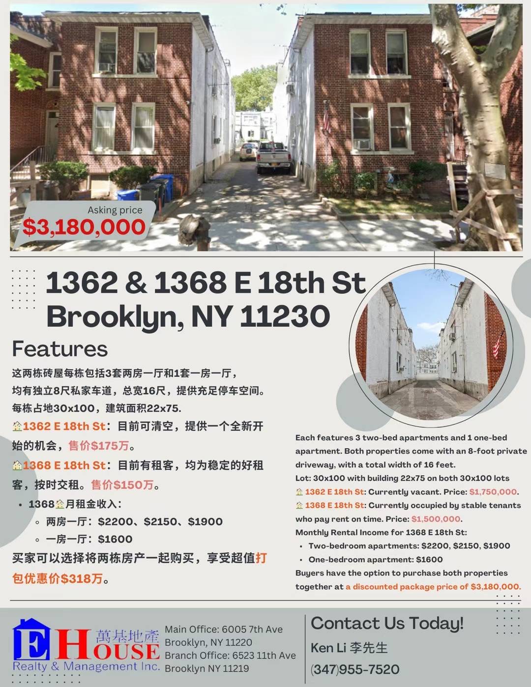 纽约布鲁克林房子出售 Brooklyn NY新上市布碌仑房屋住宅出售布鲁克林豪宅独家出售买卖东18街1362&1368两栋四家庭出售分别:175万 150万可清空.随时约看:3479557520 Ken Li