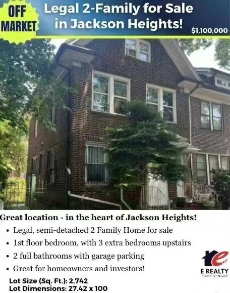 纽约杰克逊高地房子出售 Jackson Heights NY新上市杰克逊高地房屋出售克逊高地豪宅独家出售买卖Jackson Heights 合法单边2家庭出售-一楼有一间卧室,楼上有3间额外的卧室- 2个完整浴室-车库停车-占地面积:2,742平方英尺-尺寸:27.42 ×100售价$110万🎈🏡 Legal 2 Family Semi-detached home for sale in the heart of Jackson Heights!- 1st floor has a bedroom, 3 extra bedrooms upstairs- 2 full baths - garage parking- lot size: 2,742 sq ft- lot dimensions: 27.42 x 100$1,100,000 电话917 969 8898