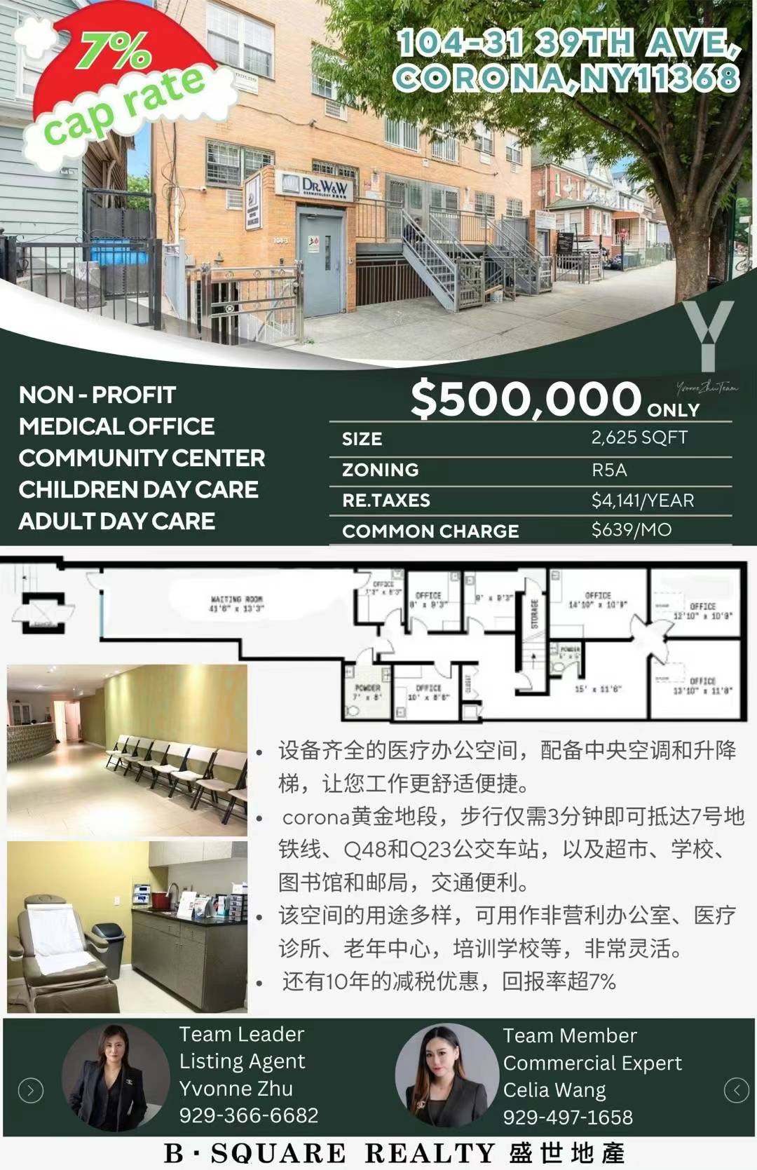 纽约商业地产出售 新上市🚩独家代理商业出售$50w▪设备齐全的医疗办公空间,配备中央空调和升降梯,方便病人出入。
