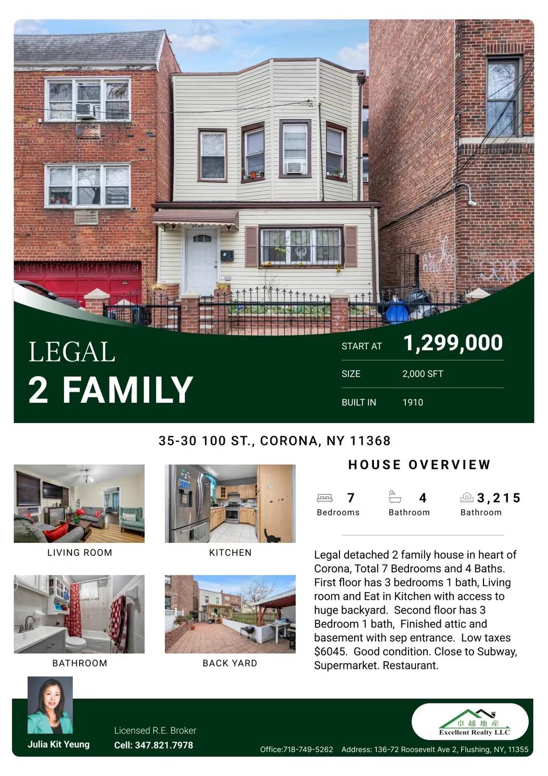 纽约可乐娜房子出售Corona NY 新上市可乐娜房屋住宅出售可乐娜豪宅独家出售买卖🎈首次公展: 周六1-2pm🎈🌺新上市獨家代理🌺 35-30 100 St Corona 可乐娜獨立兩家庭7臥4浴. 💰129.9万可乐娜闹中带静两条街走到商业繁华街地铁站,难得保养佳无需装修独立两家庭地上三层加地下室,地大后院宽敞,屋主精心打造有盖室外花园,家庭聚会好地方.