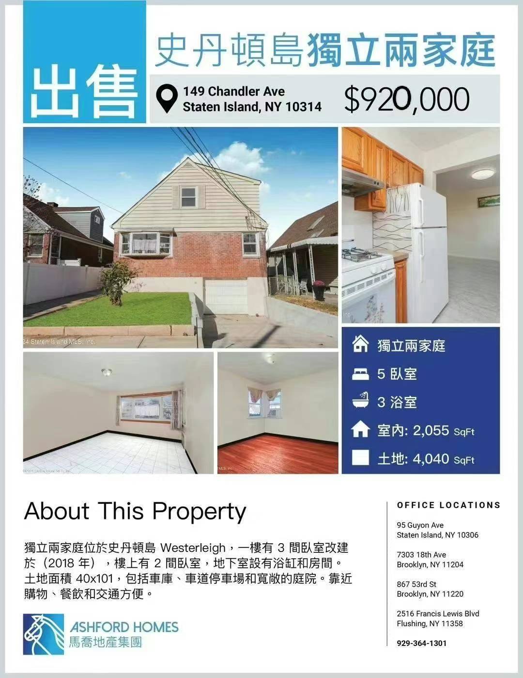 纽约史丹顿岛房子出售 华人区Staten Island NY 新上市史丹顿岛房屋住宅出售史丹顿岛豪宅独家出售买卖[庆祝]149 Chandler ave, SI, NY10314[庆祝]