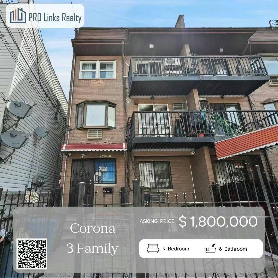 纽约可乐娜房子出售Corona NY 新上市可乐娜房屋住宅出售可乐娜豪宅独家出售买卖❤️🤝方便看👀清空过户⚠️❤️地点‼️地点‼️Corona 三家庭全砖🧱房,地面3层+高顶地下室,全新装修,墙壁另加隔音隔热棉,屋顶全新,开车10分钟至法拉盛中心,前院有独立车位配特斯拉充电桩。 只售$180万[哇]