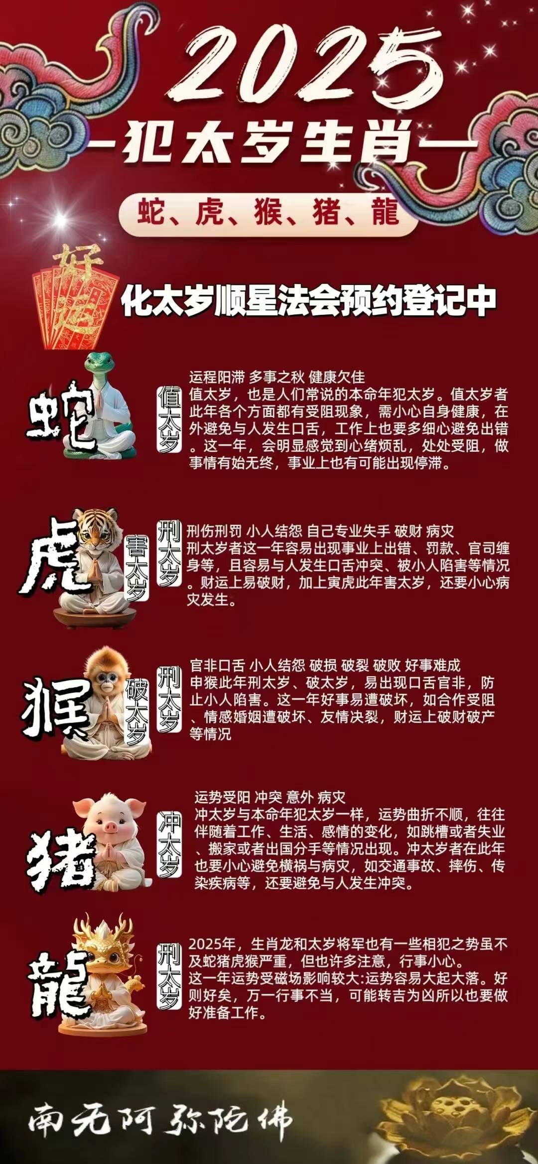 2025犯太岁生肖一蛇、虎、猴、猪、龍化太岁顺星法会预约登记中