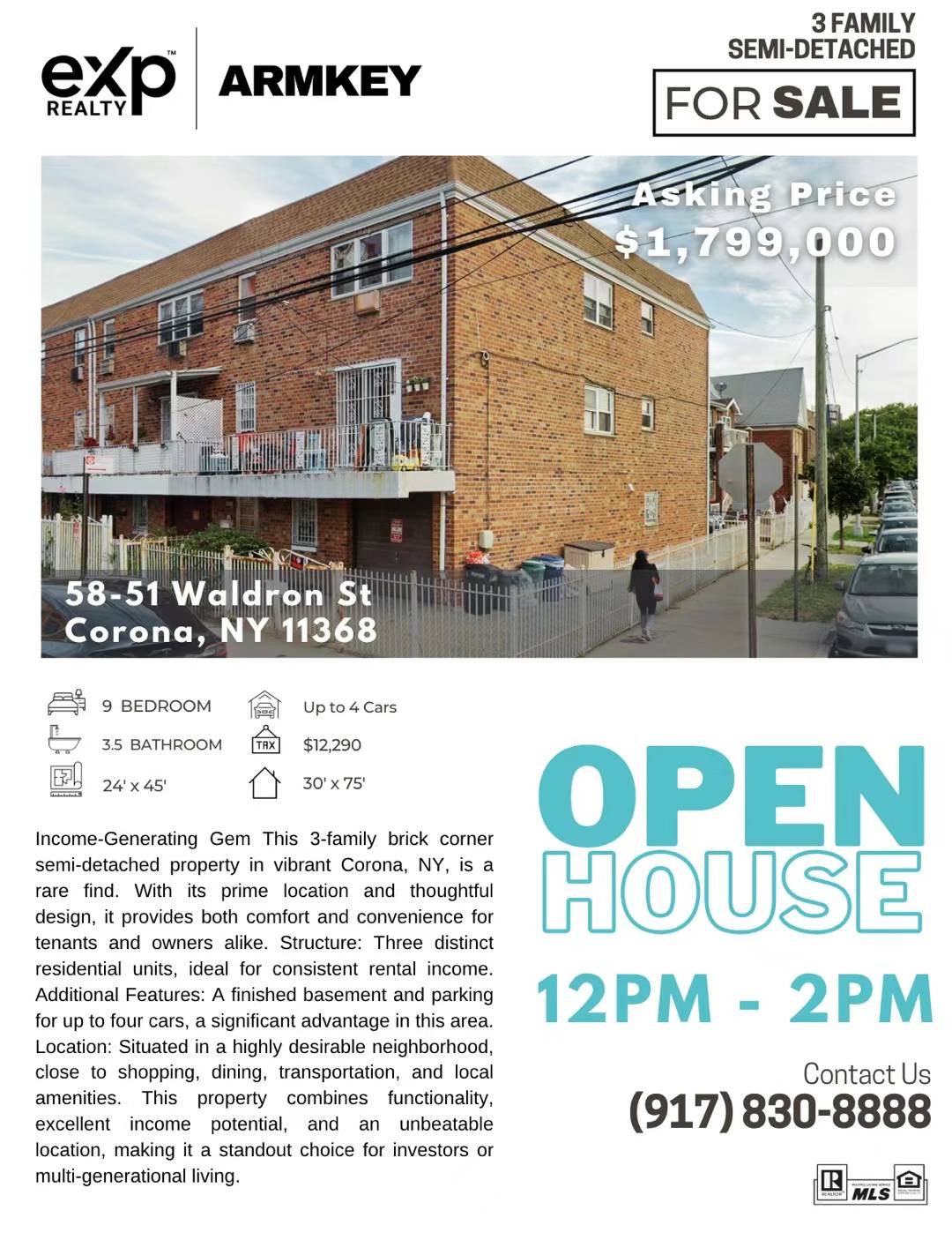 纽约可乐娜房子出售Corona NY 新上市可乐娜房屋住宅出售可乐娜豪宅独家出售买卖独家代理🎉 Corona 3家庭 街角砖屋,半独立售$180万 - 周日 12/15 公展,需预约 12-2PM精装修, 投资者首选收租王: 3楼 $2600 3房2楼 $2200 3 房1楼 $2000 3 房完成地库 $800房子 : Bldg Size: 25 x 45面积 : Sqft: 3,222地 :Lot Size: 30 x 75地税 :Tax Yr$: 12,290.00