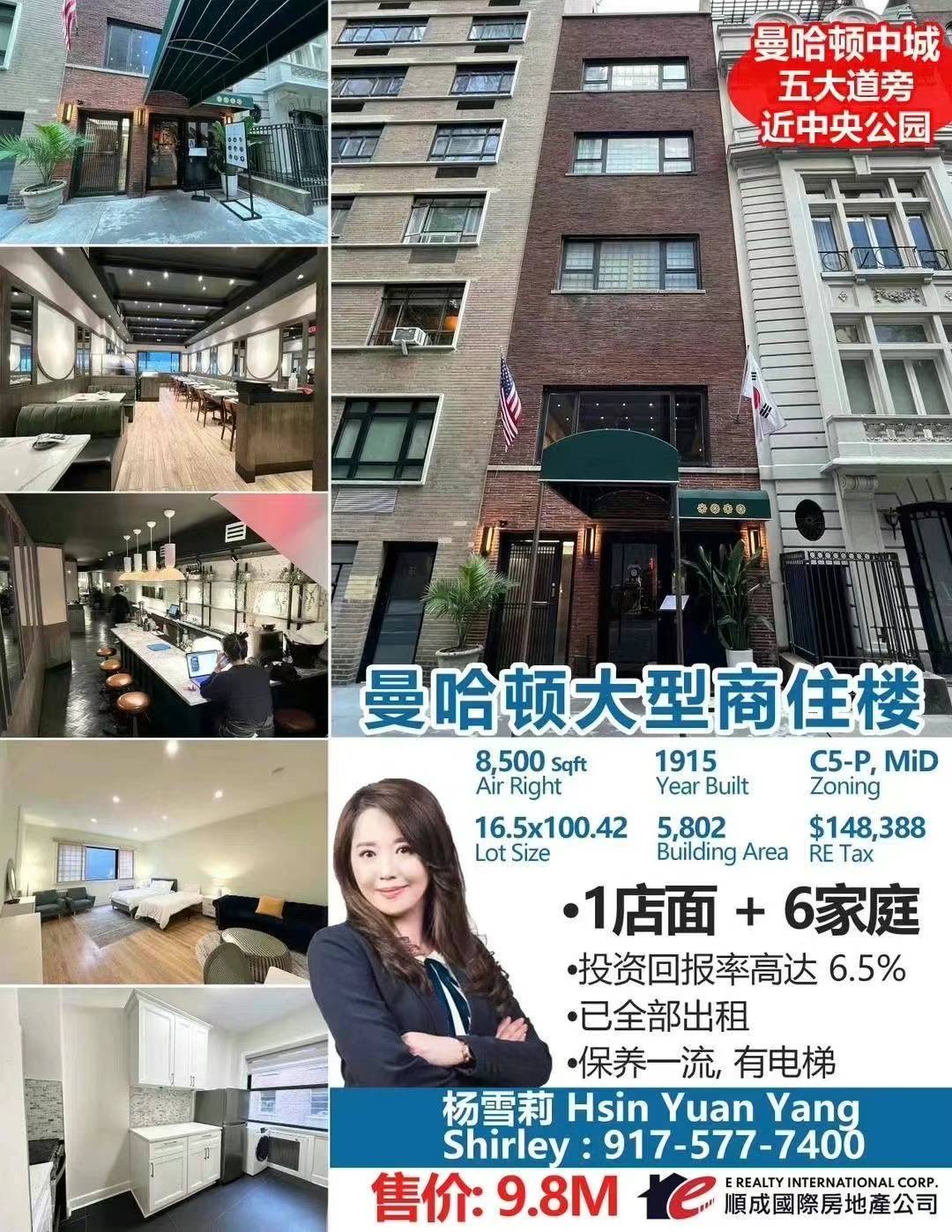 纽约曼哈顿豪华康斗出售 Manhattan Condo NY新上市曼哈顿高级康斗出售曼哈顿豪华康斗独家出售买卖順成 🎉独家上市!必看!6家庭+1店面土地面积:1,657平方英尺房屋面积:5,802平方英尺建造年份:1915年Zoning: C5-P曼哈顿中城黄金商业地段,人流密集,商业繁华。临近标志性地标,如洛克菲勒中心、百老汇剧院区、第五大道奢侈品购物区、百万富翁街、中央公园等!这栋五层建筑配有电梯,地下室及一、二层楼目前由一家高档餐厅租用。楼内还有6个新装修的单间公寓,大楼维护良好。投资回报率高理想选择。Asking $9.8 M 欢迎咨询!