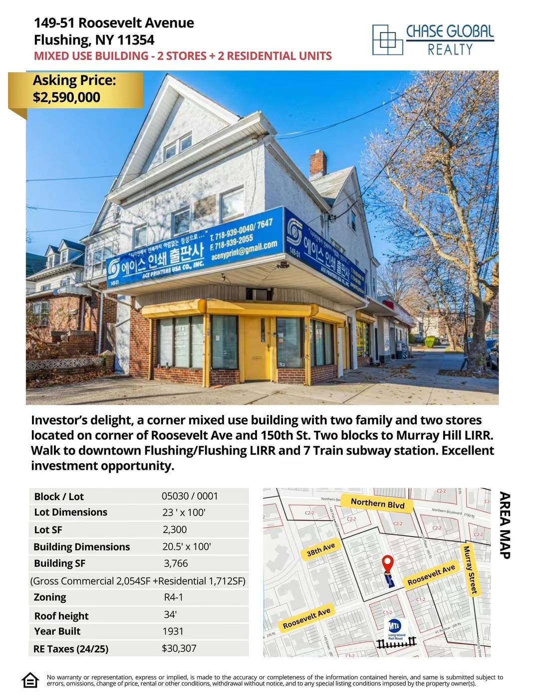 Investor’s delight, a corner mixed use building with two family and two stores located on corner of Roosevelt Ave and 150th St. Walk to Murray Hill LIRR/ Flushing LIRR and 7 Train subway station. Excellent investment opportunity.