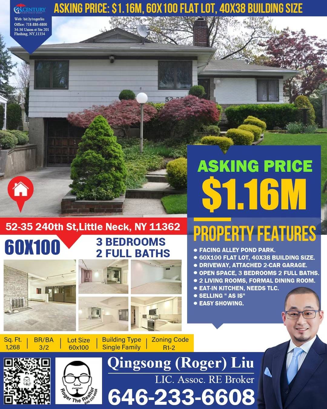 纽约小颈房子出售Little Neck NY 新上市小颈房屋出售小颈豪宅独家出售买卖好房不等人 明天周三下午5:30-6:30 看房 52-35 240ST 11362 新晋小颈华人豪宅区 60X100地。 建筑40X38. 地面两层。 可加建一层。三房两全浴。双客厅双餐厅。两家庭格局。要价116万。相当于卖地。对面就是公园。好学区996。需装修